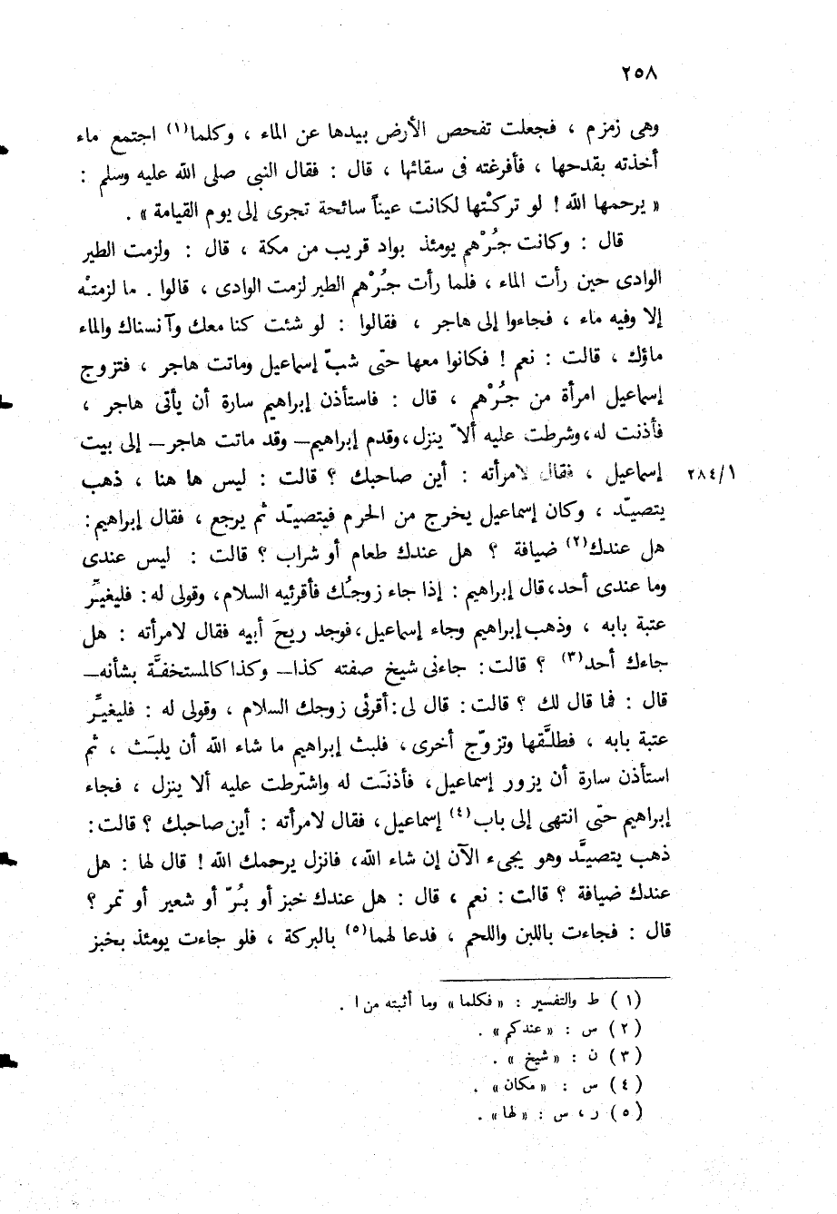 قَالَ: وَكَانَتْ جُرْهُمُ يَوْمَئِذٍ بِوَادٍ قَرِيبٍ مِنْ مَكَّةَ، قَالَ: وَلَزِمَتِ الطَّيْرُ الْوَادِي حِينَ رَأَتِ الْمَاءَ، فَلَمَّا رَأَتْ جُرْهُمُ الطَّيْرَ لَزِمَتِ الْوَادِي، قَالُوا مَا لَزِمَتْهُ إِلا وَفِيهِ مَاءٌ، فَجَاءُوا إِلَى هَاجَرَ، فَقَالُوا: لو شئت كنا معك وآنسناك والماء ماؤك، قَالَتْ: نَعَمْ! فَكَانُوا مَعَهَا حَتَّى شَبَّ إِسْمَاعِيلُ وَمَاتَتْ هَاجَرُ، فَتَزَوَّجَ إِسْمَاعِيلُ امْرَأَةً مِنْ جُرْهُمَ، قَالَ: فَاسْتَأْذَنَ إِبْرَاهِيمُ سَارَّةَ أَنْ يَأْتِيَ هَاجَرَ، فأذنت له، وشرطت عليه الا يَنْزِلَ، وَقَدِمَ إِبْرَاهِيمُ- وَقَدْ مَاتَتْ هَاجَرُ- إِلَى بَيْتِ إِسْمَاعِيلَ، فَقَالَ لامْرَأَتِهِ: أَيْنَ صَاحِبُكِ؟ قَالَتْ: ليس هاهنا، ذَهَبَ يَتَصَيَّدُ، وَكَانَ إِسْمَاعِيلُ يَخْرُجُ مِنَ الْحَرَمِ فَيَتَصَيَّدُ ثُمَّ يَرْجِعُ، فَقَالَ إِبْرَاهِيمُ: