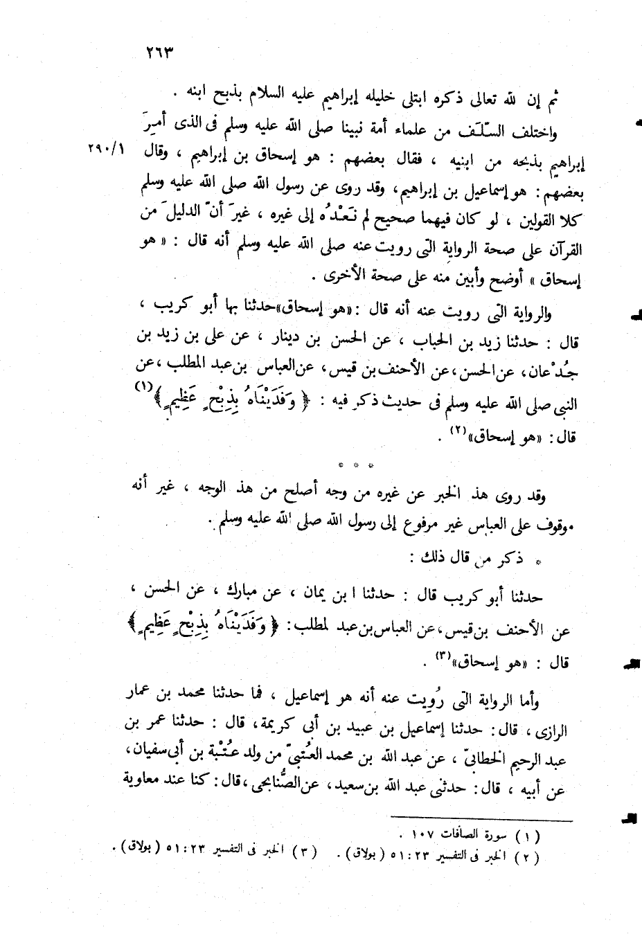 حدثنا أبو كريب قَالَ: حَدَّثَنَا ابْنُ يَمَانٍ، عَنْ مُبَارَكٍ، عَنِ الْحَسَنِ، عَنِ الأَحْنَفِ بْنِ قَيْسٍ، عَنِ الْعَبَّاسِ بن عبد المطلب: «وَفَدَيْناهُ بِذِبْحٍ عَظِيمٍ» قَالَ: هُوَ إِسْحَاقُ وَأَمَّا الرِّوَايَةُ الَّتِي رُوِيَتْ عَنْهُ أَنَّهُ هُوَ إِسْمَاعِيلُ، فَمَا حَدَّثَنَا مُحَمَّدُ بْنُ عَمَّارٍ الرَّازِيُّ، قَالَ: حَدَّثَنَا إِسْمَاعِيلُ بْنُ عُبَيْدِ بْنِ أَبِي كَرِيمَةَ، قَالَ: حَدَّثَنَا عُمَرُ بْنُ عَبْدِ الرَّحِيمِ الْخَطَّابِيُّ، عَنْ عَبْدِ اللَّهِ بْنِ مُحَمَّدٍ الْعُتْبِيِّ مِنْ وَلَدِ عُتْبَةَ بْنِ أَبِي سُفْيَانَ، عَنْ أَبِيهِ، قَالَ: حَدَّثَنِي عَبْدُ اللَّهِ بْنُ سَعِيدٍ، عَنِ الصُّنَابِحِيِّ، قَالَ: كُنَّا عند معاويه
