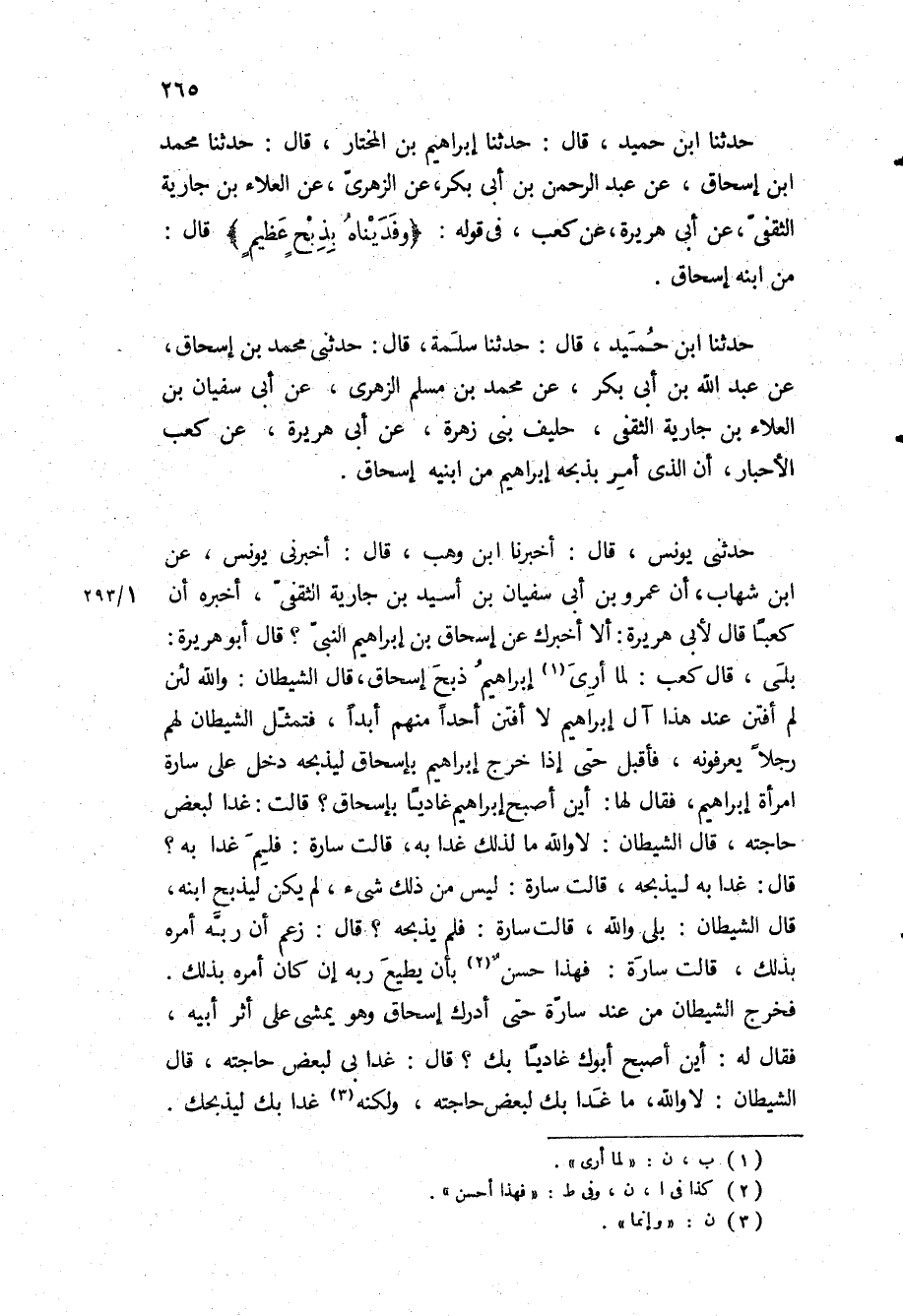 حَدَّثَنَا ابْنُ حُمَيْدٍ، قال: حَدَّثَنَا سلمة، قَالَ: حَدَّثَنِي مُحَمَّدُ بْنُ إِسْحَاقَ، عَنْ عَبْدِ الله بن أبي بكر، عَنْ مُحَمَّدِ بْنِ مُسْلِمٍ الزُّهْرِيِّ، عَنْ أَبِي سُفْيَانَ بْنِ الْعَلاءِ بْنِ جَارِيَةَ الثَّقَفِيِّ، حَلِيفِ بَنِي زُهْرَةَ، عَنْ أَبِي هُرَيْرَةَ، عَنْ كَعْبِ الأَحْبَارِ، أَنَّ الَّذِي أُمِرَ بِذَبْحِهِ إِبْرَاهِيمُ مِنَ ابْنَيْهِ إِسْحَاقَ.