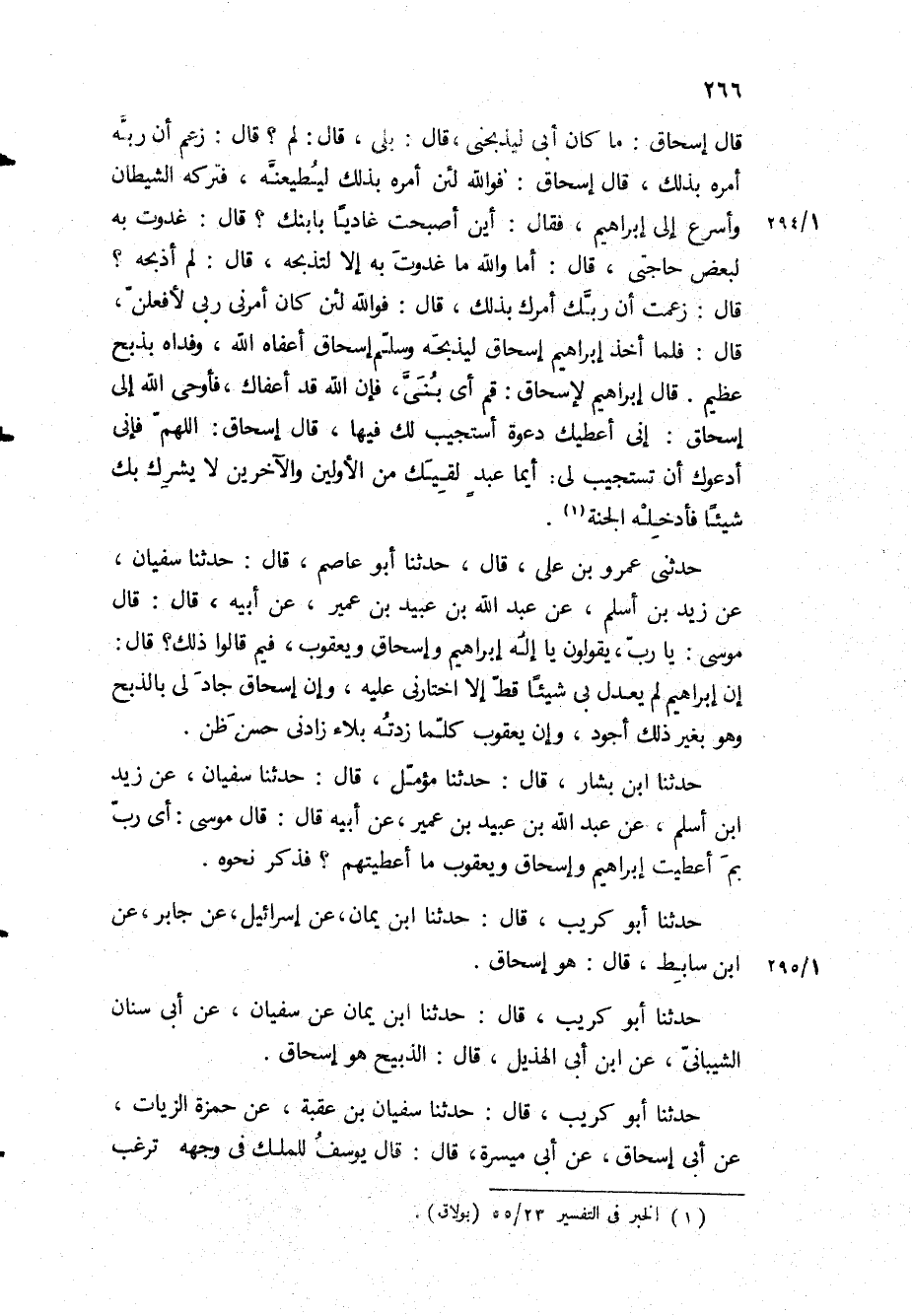 قَالَ إِسْحَاقُ: مَا كَانَ أَبِي لِيَذْبَحَنِي، قَالَ: بَلَى، قَالَ: لِمَ؟ قَالَ: زَعَمَ أَنَّ رَبَّهُ امره بذلك، قال إسحاق: فو الله لِئَنْ أَمَرَهُ بِذَلِكَ لَيُطِيعَنَّهُ، فَتَرَكَهُ الشَّيْطَانُ وَأَسْرَعَ إِلَى إِبْرَاهِيمَ، فَقَالَ: أَيْنَ أَصْبَحْتَ غَادِيًا بِابْنِكَ؟ قَالَ: غَدَوْتُ بِهِ لِبَعْضِ حَاجَتِي، قَالَ: أَمَا وَاللَّهِ مَا غَدَوْتَ بِهِ إِلا لِتَذْبَحَهُ، قَالَ: لِمَ أَذْبَحُهُ؟