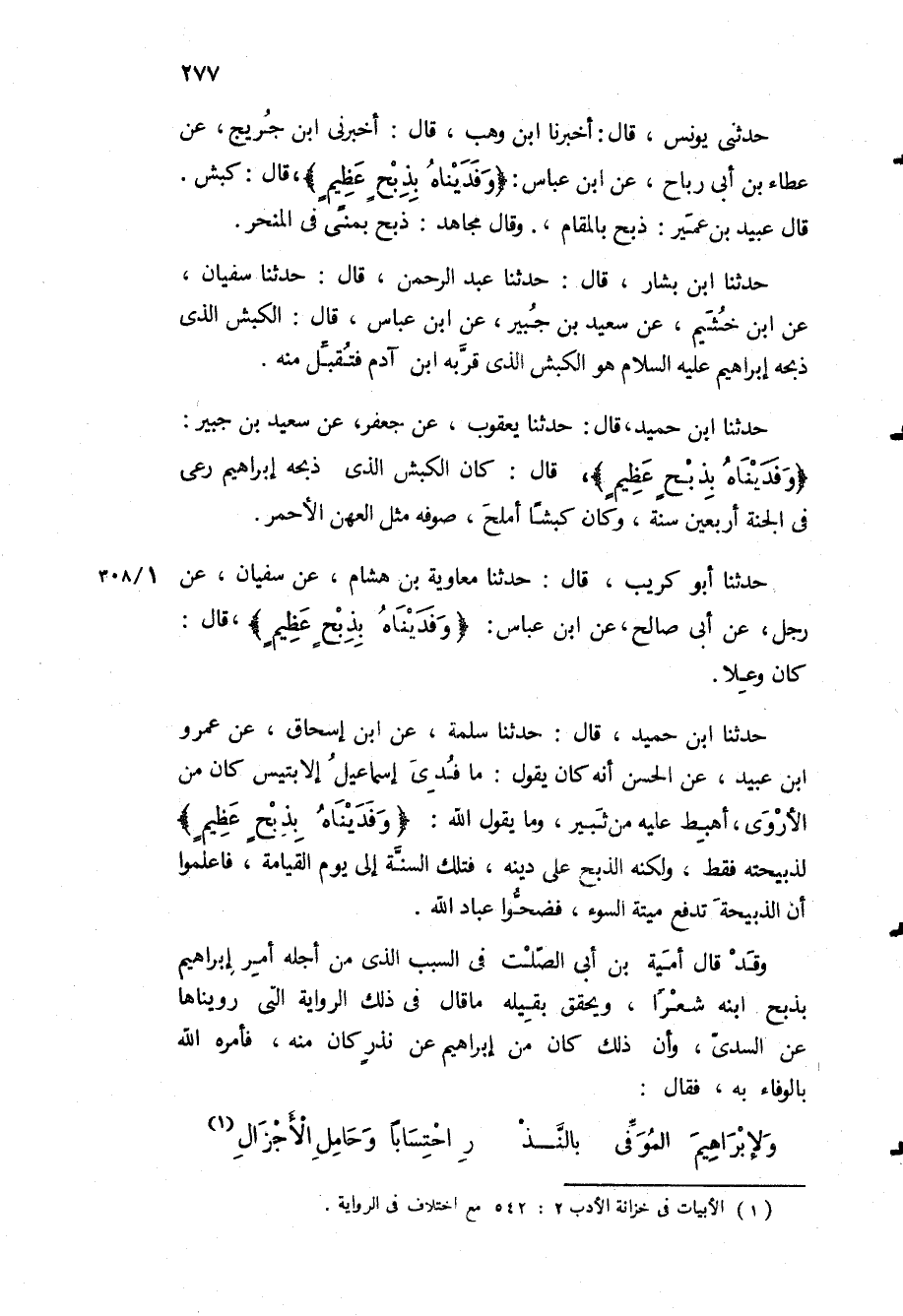 حدثنا ابْنُ بَشَّارٍ، قَالَ: حَدَّثَنَا عَبْدُ الرَّحْمَنِ، قَالَ: حَدَّثَنَا سُفْيَانُ، عَنِ ابْنِ خُثَيْمٍ، عَنْ سَعِيدِ بْنِ جُبَيْرٍ، عَنِ ابْنِ عَبَّاسٍ، قال: الكبش الذى ذبحه ابراهيم ع هُوَ الْكَبْشُ الَّذِي قَرَّبَهُ ابْنُ آدَمَ فَتُقُبِّلَ مِنْهُ.