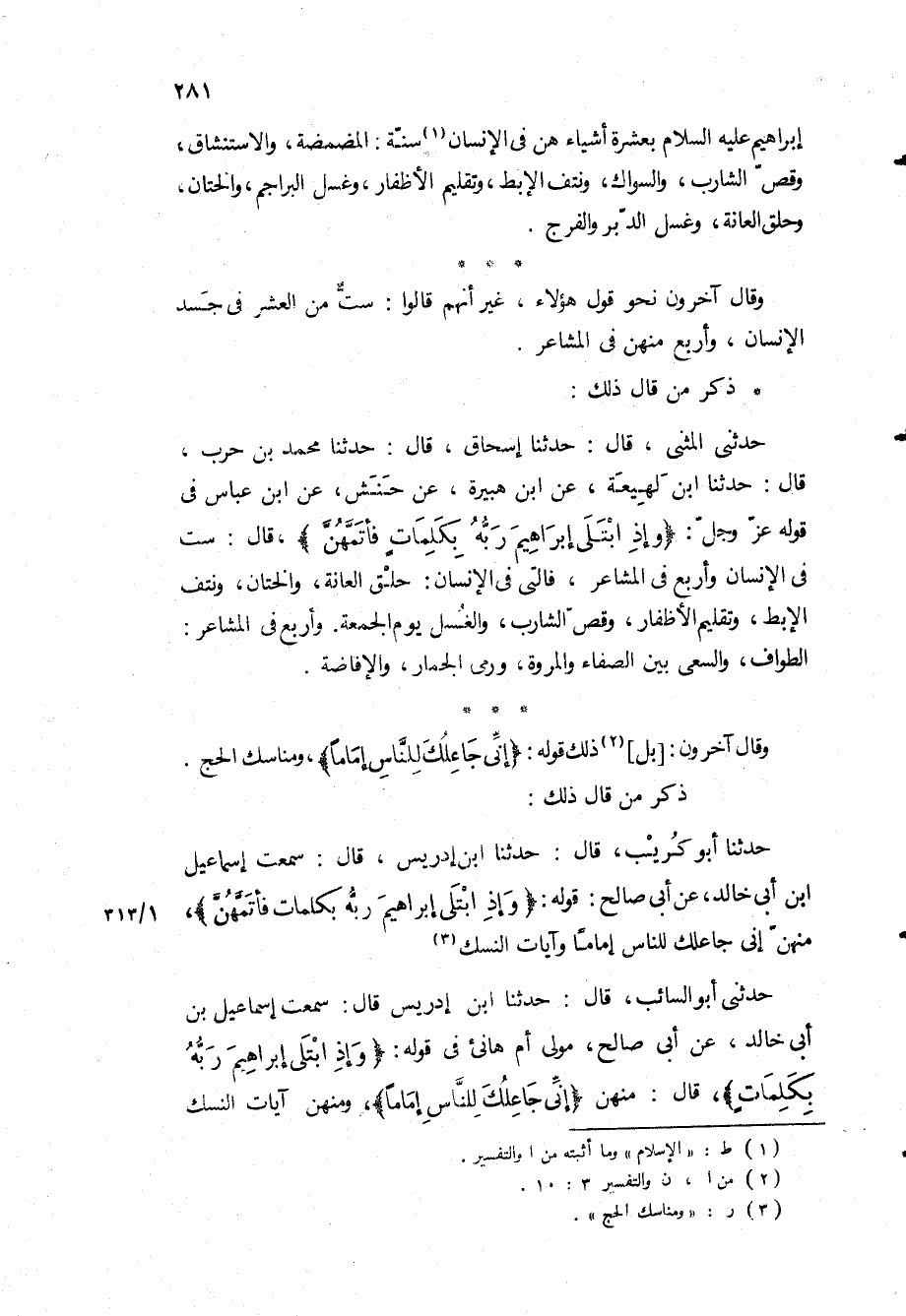 حَدَّثَنِي الْمُثَنَّى، قَالَ: حَدَّثَنَا إِسْحَاقُ، قَالَ: حَدَّثَنَا مُحَمَّدُ بْنُ حَرْبٍ، قَالَ: حَدَّثَنَا ابْنُ لَهِيعَةَ، عَنِ ابْنِ هُبَيْرَةَ، عَنْ حَنَشٍ، عَنِ ابْنِ عَبَّاسٍ فِي قَوْلِهِ عَزَّ وَجَلَّ: «وَإِذِ ابْتَلى إِبْراهِيمَ رَبُّهُ بِكَلِماتٍ فَأَتَمَّهُنَّ» ، قَالَ: سِتٌّ فِي الإِنْسَانِ وَأَرْبَعٌ فِي الْمَشَاعِرِ، فَالَّتِي فِي الإِنْسَانِ: حَلْقُ الْعَانَةِ، وَالْخِتَانُ، وَنَتْفُ الإِبِطِ، وَتَقْلِيمُ الأَظْفَارِ، وَقَصُّ الشَّارِبِ، وَالْغُسْلُ يَوْمَ الْجُمُعَةِ وَأَرْبَعٌ فِي الْمَشَاعِرِ: