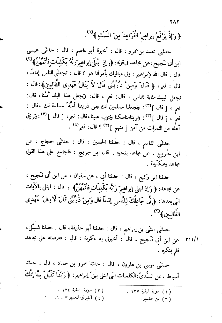 حَدَّثَنَا ابْنُ وَكِيعٍ، قَالَ: حَدَّثَنَا أَبِي، عَنْ سُفْيَانَ، عَنِ ابْنِ أَبِي نَجِيحٍ، عَنْ مُجَاهِدٍ: «وَإِذِ ابْتَلى إِبْراهِيمَ رَبُّهُ بِكَلِماتٍ فَأَتَمَّهُنَّ» ، قَالَ: ابْتُلِيَ بِالآيَاتِ الَّتِي بَعْدَهَا: «إِنِّي جاعِلُكَ لِلنَّاسِ إِماماً قالَ وَمِنْ ذُرِّيَّتِي قالَ لا يَنالُ عَهْدِي الظَّالِمِينَ» .