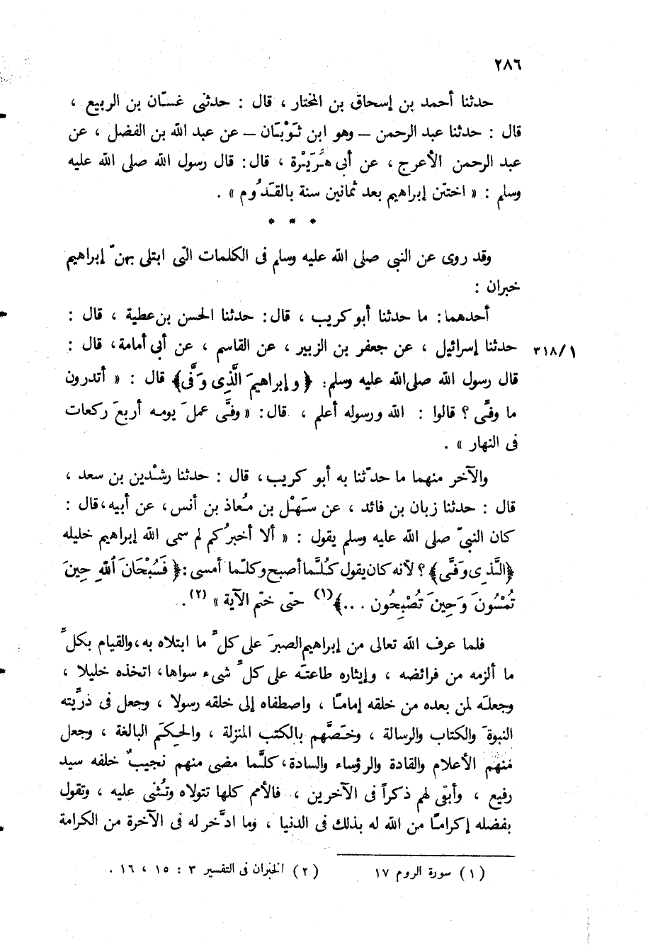 [كان النبي ص يَقُولُ: أَلا أُخْبِرُكُمْ لِمَ سَمَّى اللَّهُ إِبْرَاهِيمَ خَلِيلَهُ «الَّذِي وَفَّى» ؟ لأَنَّهُ كَانَ يَقُولُ كُلَّمَا أَصْبَحَ وَكُلَّمَا أَمْسَى: «فَسُبْحانَ اللَّهِ حِينَ تُمْسُونَ وَحِينَ تُصْبِحُونَ» حَتَّى خَتَمَ الآيَةَ] .