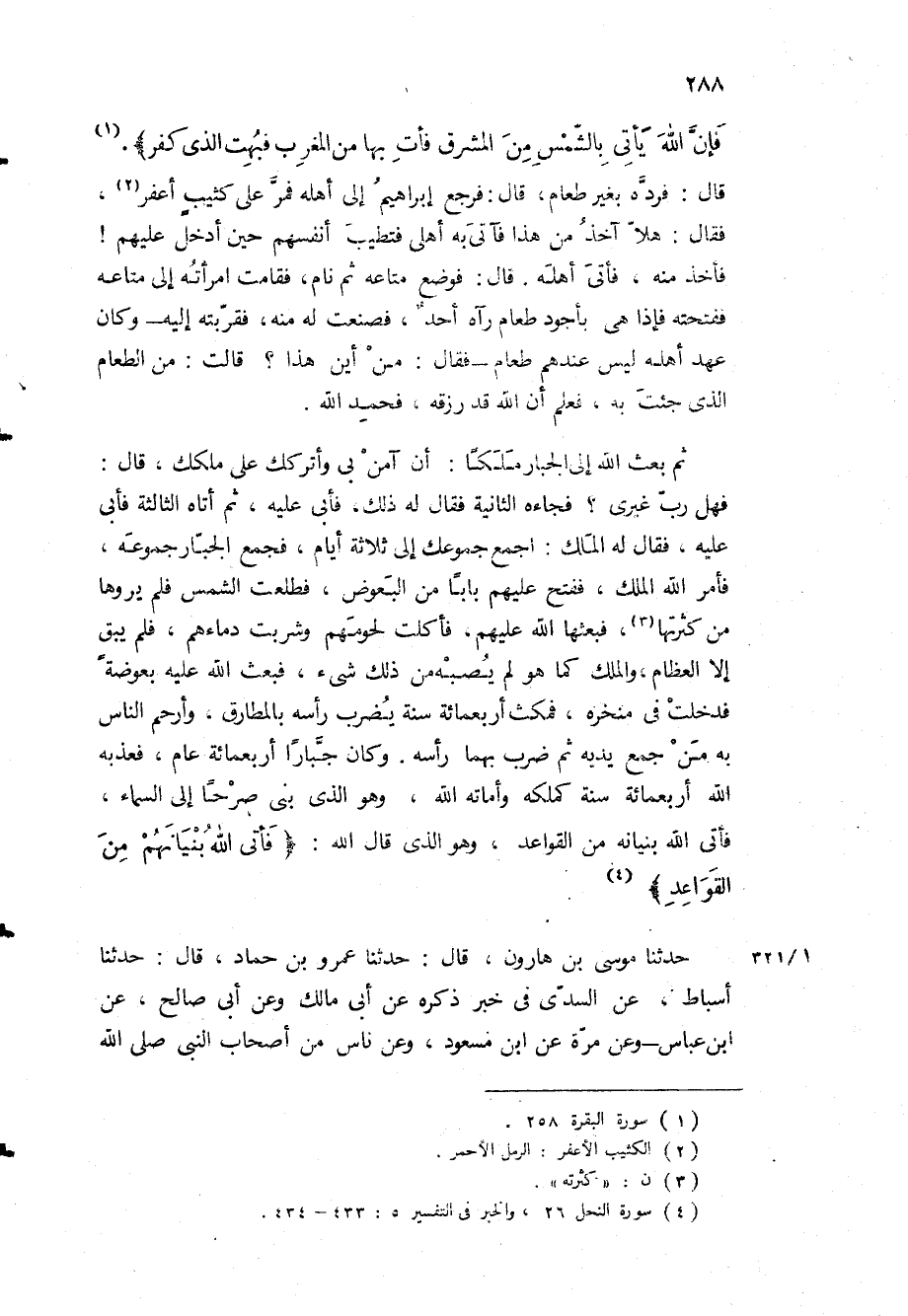 فَإِنَّ اللَّهَ يَأْتِي بِالشَّمْسِ مِنَ الْمَشْرِقِ فَأْتِ بِها مِنَ الْمَغْرِبِ فَبُهِتَ الَّذِي كَفَرَ» قال: فرده بغير طعام، قال: فرجع إبراهيم إلى أهله فمر على كثيب أعفر، فقال: هلا آخذ من هذا فآتي به أهلي فتطيب أنفسهم حين أدخل عليهم! فأخذ منه، فأتى أهله قال: فوضع متاعه ثم نام، فقامت امرأته إلى متاعه ففتحته فإذا هي بأجود طعام رآه أحد، فصنعت له منه، فقربته إليه- وكان عهد أهله ليس عندهم طعام- فقال: من أين هذا؟ قالت: من الطعام الذي جئت به، فعلم أن الله قد رزقه، فحمد الله.