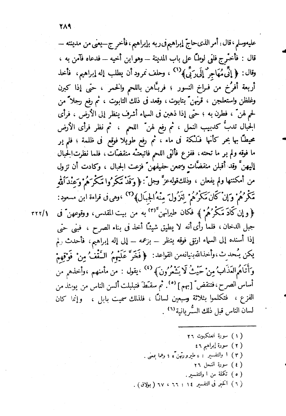 عَلَيْهِ وَسَلَّمَ، قَالَ: أَمَرَ الَّذِي حَاجَّ إِبْرَاهِيمَ فِي رَبِّهِ بِإِبْرَاهِيمَ، فَأُخْرِجَ- يَعْنِي مِنْ مَدِينَتِهِ- قَالَ: فَأُخْرِجَ فَلَقِيَ لُوطًا عَلَى بَابِ الْمَدِينَةِ- وَهُوَ ابْنُ أَخِيهِ- فَدَعَاهُ فَآمَنَ بِهِ، وَقَالَ: «إِنِّي مُهاجِرٌ إِلى رَبِّي» ، وَحَلَفَ نُمْرُودُ أَنْ يَطْلُبَ إِلَهَ إِبْرَاهِيمَ، فَأَخَذَ أَرْبَعَةَ أَفْرُخٍ مِنْ فرَاخِ النُّسُورِ، فَرَبَّاهُنَّ بِاللَّحْمِ وَالْخَمْرِ، حَتَّى إِذَا كَبُرْنَ وَغَلُظْنَ وَاسْتَعْلَجْنَ، قَرَنَهُنَّ بِتَابُوتٍ، وَقَعَدَ فِي ذَلِكَ التَّابُوتِ، ثُمَّ رَفَعَ رِجْلا مِنْ لَحْمٍ لَهُنَّ، فَطِرْنَ بِهِ، حَتَّى إِذَا ذَهَبْنَ فِي السَّمَاءِ أَشْرَفَ يَنْظُرُ إِلَى الأَرْضِ، فَرَأَى الْجِبَالَ تَدُبُّ كَدَبِيبِ النَّمْلِ، ثُمَّ رَفَعَ لَهُنَّ اللَّحْمَ، ثُمَّ نَظَرَ فَرَأَى الأَرْضَ مُحِيطًا بِهَا بَحْرٌ كَأَنَّهَا فَلْكَةٌ فِي مَاءٍ، ثُمَّ رَفَعَ طَوِيلا فَوَقَعَ فِي ظُلْمَةٍ، فَلَمْ يَرَ مَا فَوْقَهُ وَلَمْ يَرَ مَا تَحْتَهُ، فَفَزِعَ فَأَلْقَى اللَّحْمَ فَاتَّبَعَتْهُ مُنْقَضَّاتٍ، فَلَمَّا نَظَرَتِ الْجِبَالُ إِلَيْهِنَّ وَقَدْ أَقْبَلْنَ مُنْقَضَّاتٍ وَسَمِعْنَ حَفِيفَهُنَّ فَزِعَتِ الْجِبَالُ، وَكَادَتْ أَنْ تَزُولَ مِنْ أَمْكِنَتِهَا وَلَمْ يَفْعَلْنَ، وَذَلِكَ قَوْلُهُ عَزَّ وَجَلَّ: «وَقَدْ مَكَرُوا مَكْرَهُمْ وَعِنْدَ اللَّهِ مَكْرُهُمْ وَإِنْ كانَ مَكْرُهُمْ لِتَزُولَ مِنْهُ الْجِبالُ» ، وَهِيَ فِي قِرَاءَةِ ابْنِ مَسْعُودٍ: