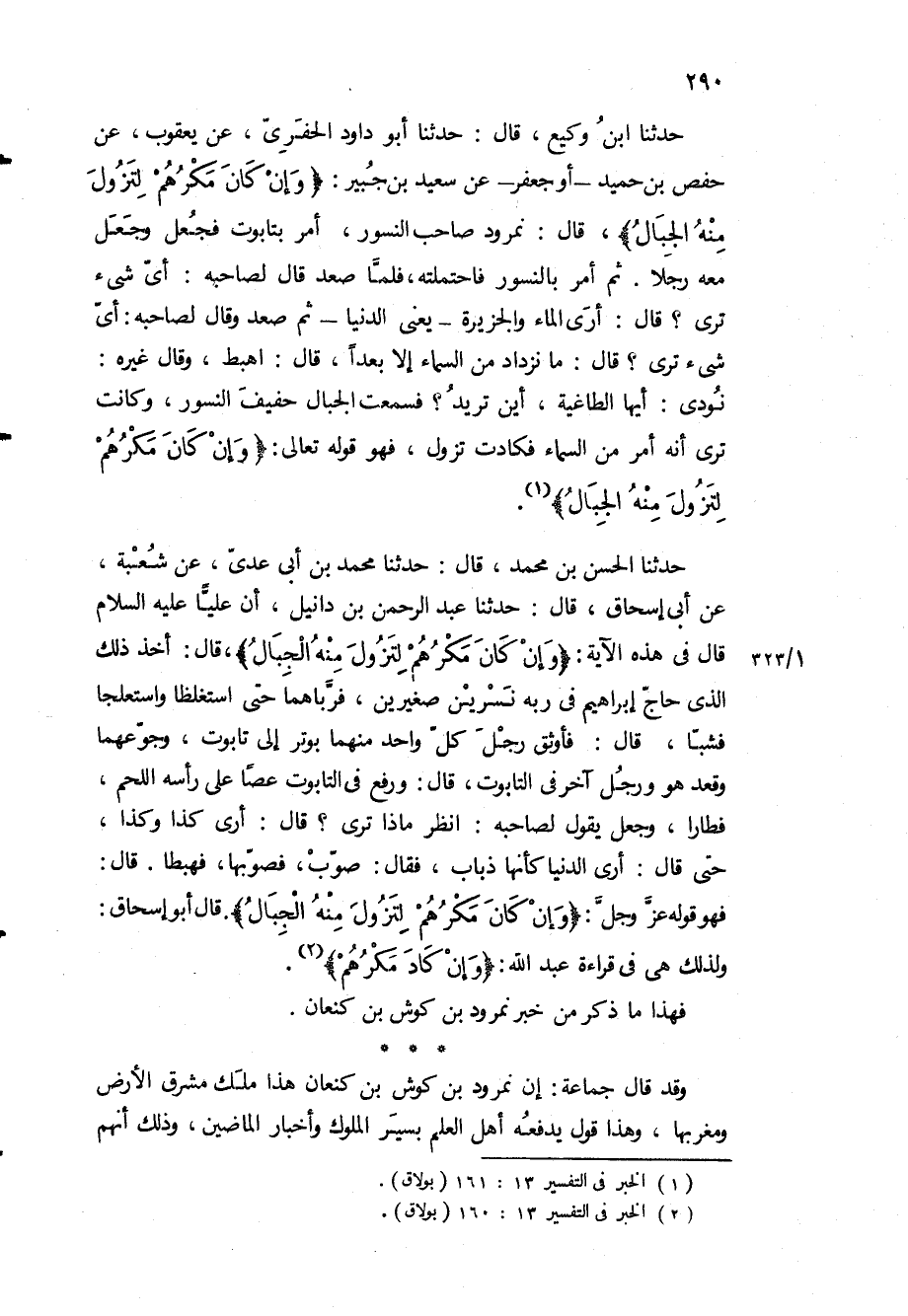 حَدَّثَنَا ابن وكيع، قال: حَدَّثَنَا أبو داود الحفري، عن يعقوب، عن حفص بن حميد- أو جعفر- عن سعيد بن جبير: «وَإِنْ كانَ مَكْرُهُمْ لِتَزُولَ مِنْهُ الْجِبالُ» ، قال: نمرود صاحب النسور، أمر بتابوت فجعل وجعل معه رجلا ثم أمر بالنسور فاحتملته، فلما صعد قال لصاحبه: أي شيء ترى؟ قال: أرى الماء والجزيرة- يعني الدنيا- ثم صعد وقال لصاحبه: أي شيء ترى؟ قال: ما نزداد من السماء إلا بعدا، قال: اهبط، وقال غيره: