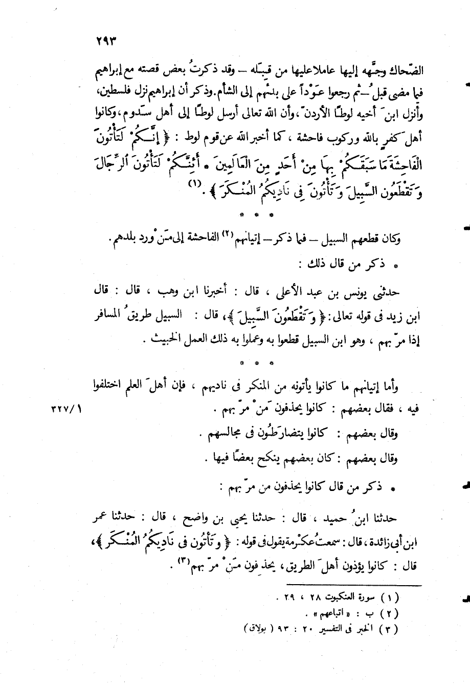 الضحاك وجهه إليها عاملا عليها من قبله- وقد ذكرت بعض قصته مع إبراهيم فيما مضى قبل- ثم رجعوا عودا على بدئهم إلى الشام وذكر أن إبراهيم نزل فلسطين، وأنزل ابن أخيه لوطا الأردن، وأن الله تعالى أرسل لوطا إلى أهل سدوم، وكانوا أهل كفر بالله وركوب فاحشة، كما أخبر الله عن قوم لوط: «إِنَّكُمْ لَتَأْتُونَ الْفاحِشَةَ مَا سَبَقَكُمْ بِها مِنْ أَحَدٍ مِنَ الْعالَمِينَ أَإِنَّكُمْ لَتَأْتُونَ الرِّجالَ وَتَقْطَعُونَ السَّبِيلَ وَتَأْتُونَ فِي نادِيكُمُ الْمُنْكَرَ» .