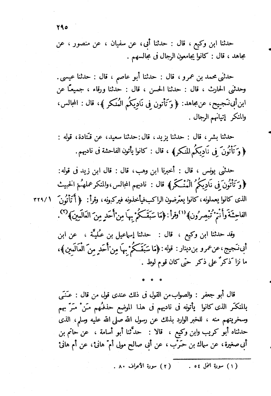 «وَتَأْتُونَ فِي نادِيكُمُ الْمُنْكَرَ» قال: ناديهم المجالس، والمنكر عملهم الخبيث الذي كانوا يعملونه، كانوا يعترضون الراكب فيأخذونه فيركبونه، وقرأ: «أَتَأْتُونَ الْفاحِشَةَ وَأَنْتُمْ تُبْصِرُونَ» وقرأ: «مَا سَبَقَكُمْ بِها مِنْ أَحَدٍ مِنَ الْعالَمِينَ» .