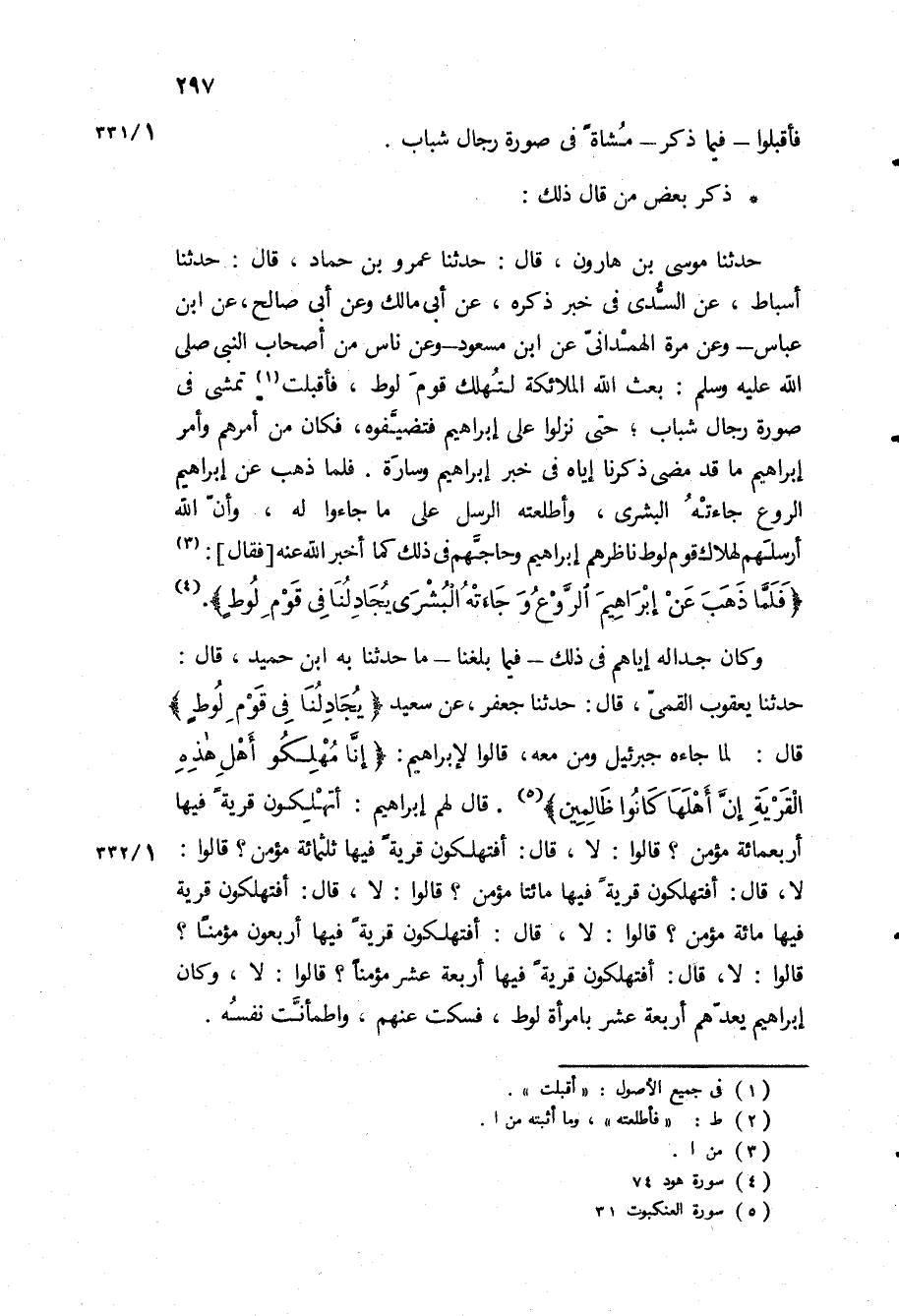 حَدَّثَنَا يعقوب القمي، قال: حَدَّثَنَا جعفر، عن سعيد «يُجادِلُنا فِي قَوْمِ لُوطٍ» قال: لما جاءه جبرئيل ومن معه، قالوا لإبراهيم: «إِنَّا مُهْلِكُوا أَهْلِ هذِهِ الْقَرْيَةِ إِنَّ أَهْلَها كانُوا ظالِمِينَ» قال لهم ابراهيم: اتهلكون قريه فيها أربعمائة مؤمن؟ قالوا: لا، قال: أفتهلكون قرية فيها ثلاثمائة مؤمن؟ قالوا: