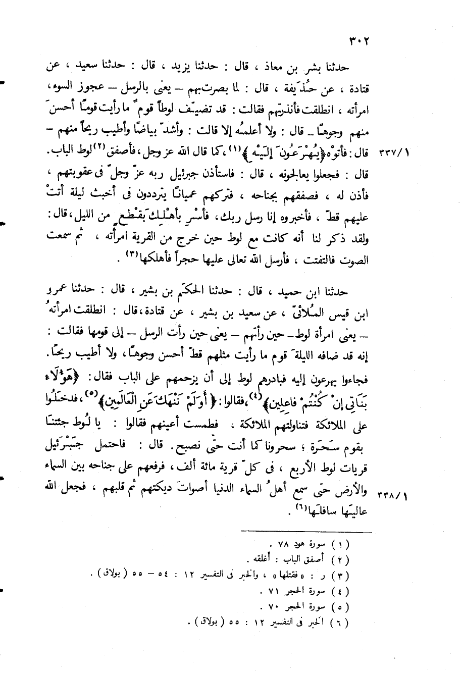 حَدَّثَنَا بِشْرُ بْنُ مُعَاذٍ، قَالَ: حَدَّثَنَا يَزِيدُ، قَالَ: حَدَّثَنَا سَعِيدٌ، عَنْ قَتَادَةَ، عَنْ حُذَيْفَةَ، قَالَ: لَمَّا بَصُرَتْ بِهِمْ- يَعْنِي بِالرُّسُلِ- عَجُوزُ السُّوءِ، امْرَأَتُهُ، انْطَلَقَتْ فَأَنْذَرَتْهُمْ فَقَالَتْ: قَدْ تَضَيَّفَ لُوطًا قَوْمٌ مَا رَأَيْتُ قَوْمًا أَحْسَنَ مِنْهُمْ وُجُوهًا- قَالَ: وَلا أَعْلَمُهُ إِلا قَالَتْ: وَأَشَدَّ بَيَاضًا وَأَطْيَبَ رِيحًا مِنْهُمْ- قَالَ: فَأَتَوْهُ «يُهْرَعُونَ إِلَيْهِ» ، كَمَا قَالَ اللَّهُ عَزَّ وَجَلَّ، فَأَصْفَقَ لُوطٌ الْبَابَ.