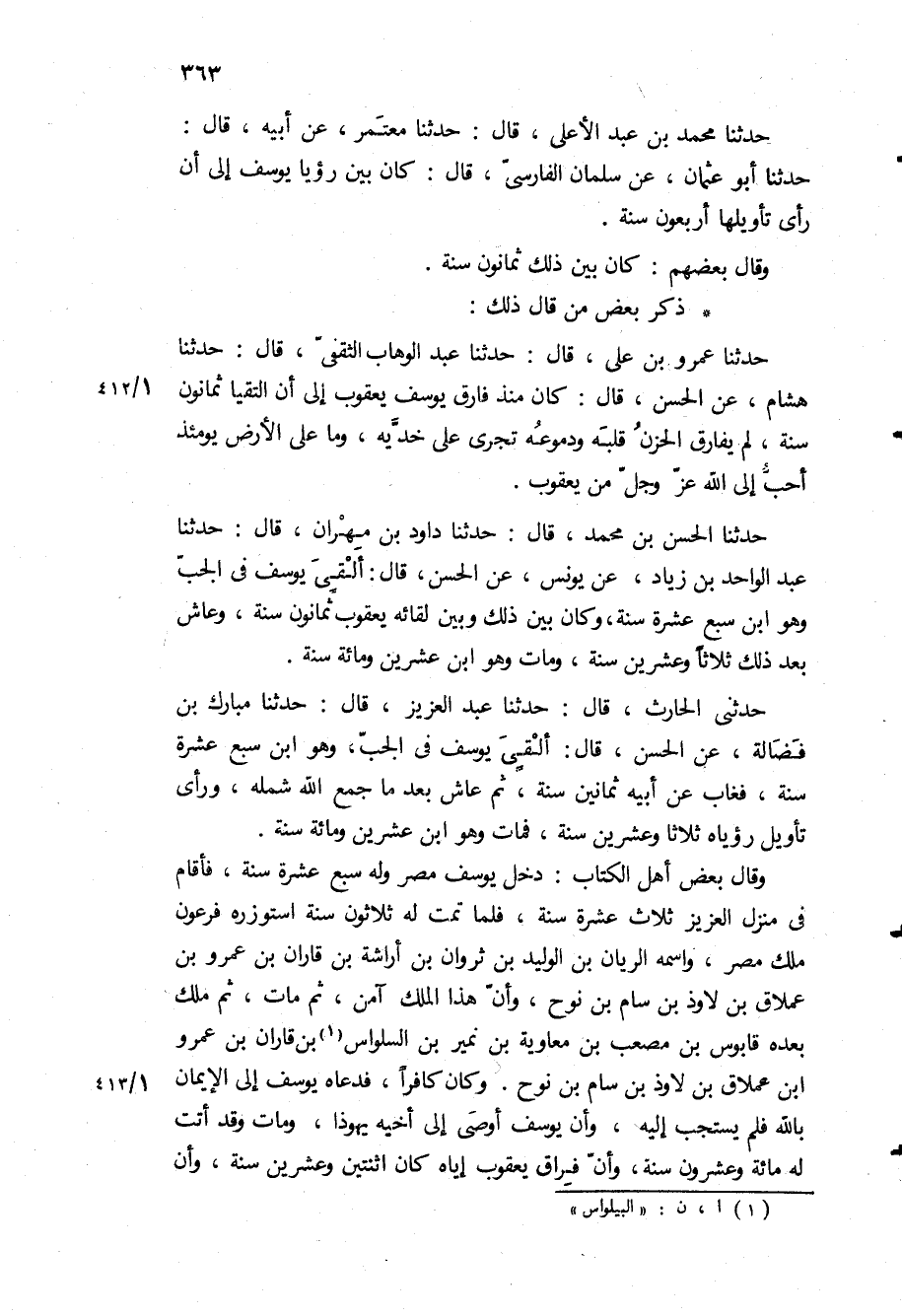 حَدَّثَنَا الحسن بن مُحَمَّد، قَالَ: حَدَّثَنَا داود بن مهران، قَالَ: حَدَّثَنَا عبد الواحد بن زياد، عن يونس، عن الحسن، قَالَ: ألقي يوسف في الجب وهو ابن سبع عشرة سنة، وكان بين ذلك وبين لقائه يعقوب ثمانون سنة، وعاش بعد ذلك ثلاثا وعشرين سنة، ومات وهو ابن عشرين ومائة سنة.