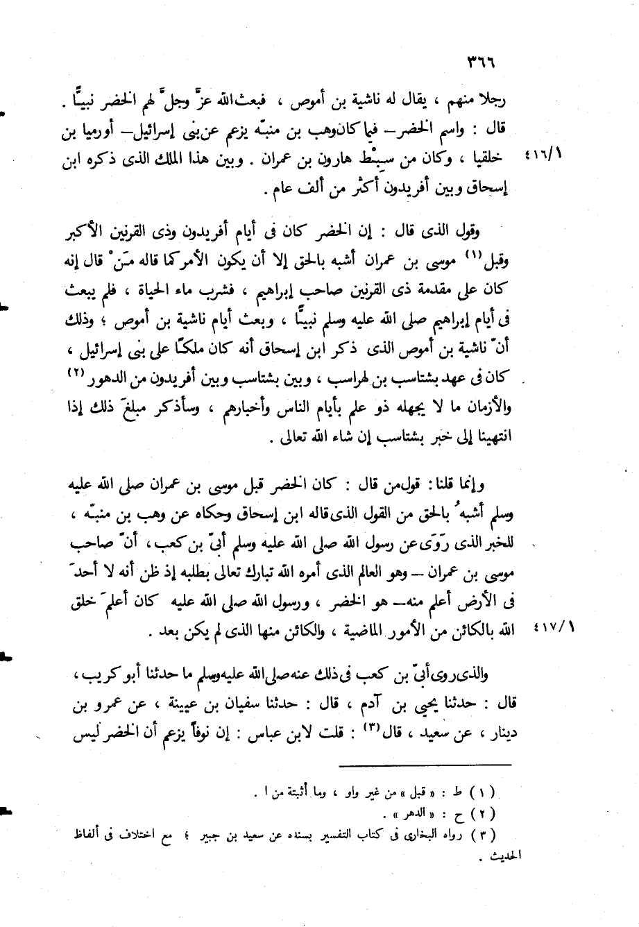 والذي روى أبي بن كعب في ذلك عنه ص مَا حَدَّثَنَا أَبُو كُرَيْبٍ، قَالَ: حَدَّثَنَا يَحْيَى بْنُ آدَمَ، قَالَ: حَدَّثَنَا سُفْيَانُ بْنُ عُيَيْنَةَ، عَنْ عَمْرِو بْنِ دِينَارٍ، عَنْ سَعِيدٍ، قَالَ: قُلْتُ لابْنِ عَبَّاسٍ: إِنَّ نَوْفًا يَزْعُمُ أَنَّ الخضر ليس
