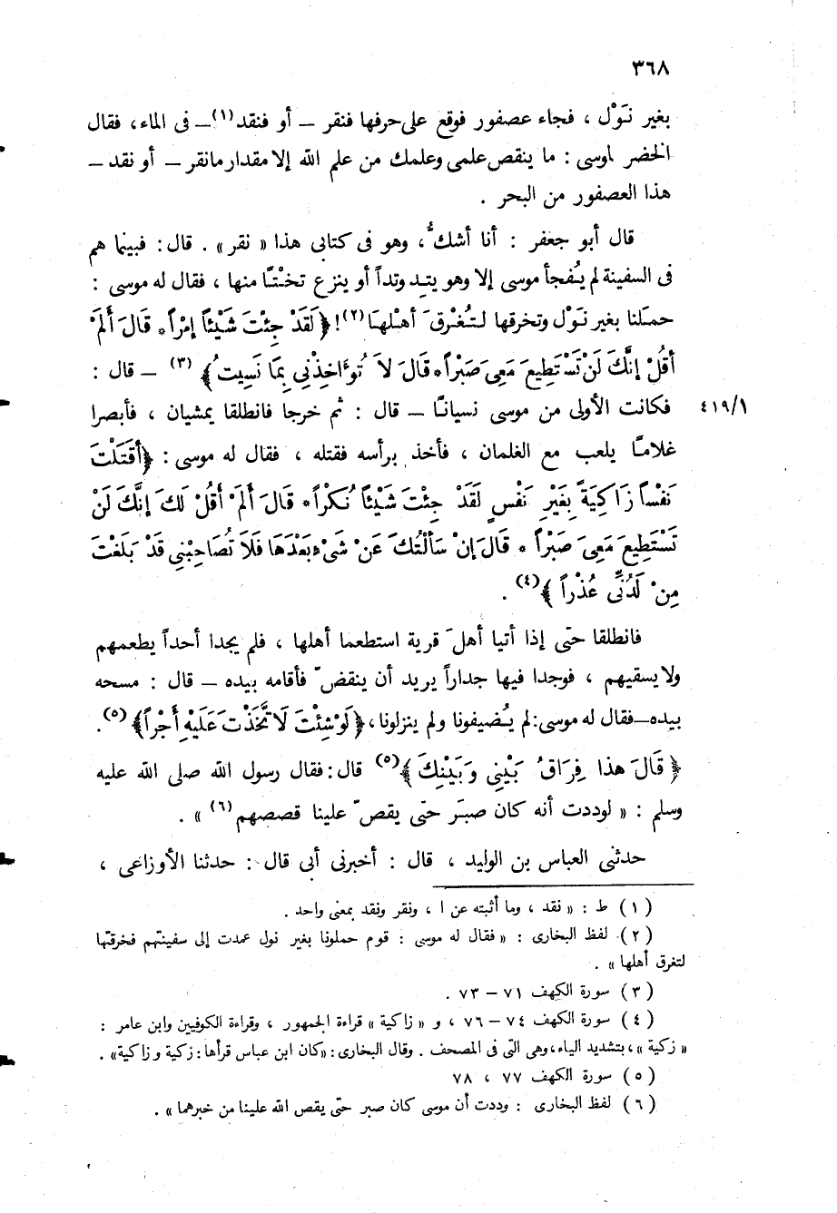 قَالَ أَبُو جَعْفَرٍ: أَنَا أَشُكُّ، وَهُوَ في كتابي هذا نقر قال: فبينما هُمْ فِي السَّفِينَةِ لَمْ يَفْجَأْ موسى إِلا وَهُوَ يَتِدُ وَتِدًا أَوْ يَنْزِعُ تَخْتًا مِنْهَا، فَقَالَ لَهُ موسى: