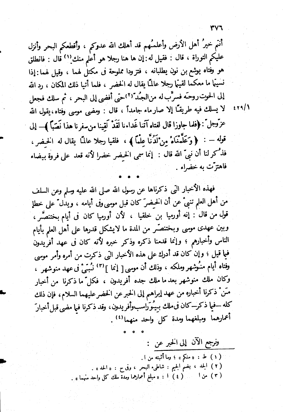 فهذه الاخبار التي ذكرناها عن رسول الله ص وعن السلف من أهل العلم تنبئ عن أن الخضر كان قبل موسى وفي أيامه، ويدل على خطإ قول من قَالَ: إنه أورميا بن خلقيا، لأن أورميا كان في ايام بختنصر، وبين عهدي موسى وبختنصر من المدة ما لا يشكل قدرها على أهل العلم بأيام الناس وأخبارهم، وإنما قدمنا ذكره وذكر خبره لأنه كان في عهد أفريدون فيما قيل، وإن كان قد أدرك على هذه الأخبار التي ذكرت من أمره وأمر موسى وفتاه أيام منوشهر وملكه، وذلك ان موسى انما نبئ في عهد منوشهر، وكان ملك منوشهر بعد ما ملك جده أفريدون، فكل ما ذكرنا من أخبار من ذكرنا أخباره من عهد ابراهيم الى الخبر عن الخضر ع، فإن ذلك كله- فيما ذكر- كان في ملك بيوراسب وأفريدون، وقد ذكرنا فيما مضى قبل أخبار أعمارهما ومبلغهما ومدة كل واحد منهما.