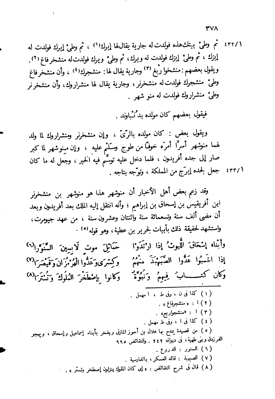 وقد زعم بعض أهل الأخبار أن منوشهر هذا هو منوشهر بن منشخرنر ابن أفريقيس بن إسحاق بن إبراهيم، وأنه انتقل إليه الملك بعد أفريدون وبعد أن مضى الف سنه وتسعمائة سنة واثنتان وعشرون سنة، من عهد جيومرت، واستشهد لحقيقة ذلك بأبيات لجرير بن عطية، وهو قوله.