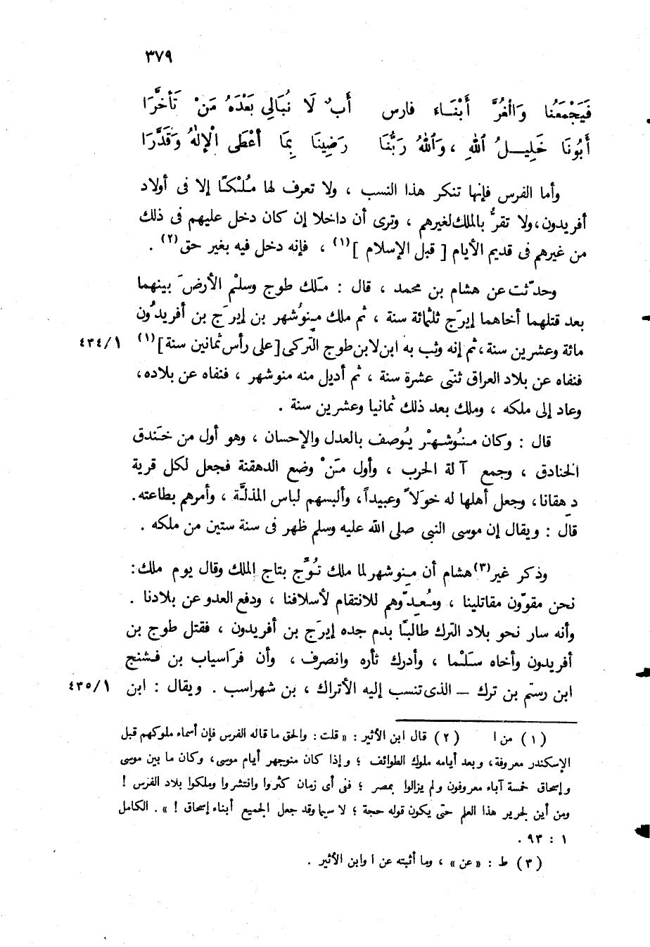 وأما الفرس فإنها تنكر هذا النسب، ولا تعرف لها ملكا إلا في أولاد أفريدون، ولا تقر بالملك لغيرهم، وترى أن داخلا إن كان دخل عليهم في ذلك من غيرهم في قديم الأيام قبل الإسلام، فإنه دخل فيه بغير حق.