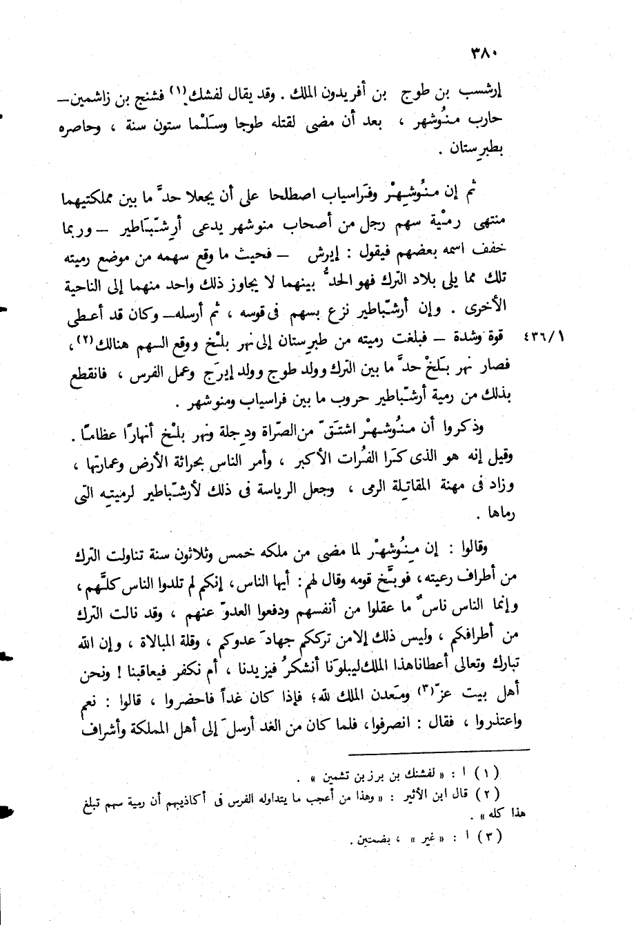 ثم ان منوشهر وفراسياب اصطلحا على أن يجعلا حد ما بين مملكتيهما منتهى رمية سهم رجل من أصحاب منوشهر يدعى ارشباطير- وربما خفف اسمه بعضهم فيقول: إيرش- فحيث ما وقع سهمه من موضع رميته تلك مما يلي بلاد الترك فهو الحد بينهما لا يجاوز ذلك واحد منهما إلى الناحية الاخرى وان ارشباطير نزع بسهم في قوسه، ثم أرسله- وكان قد أعطي قوة وشدة- فبلغت رميته من طبرستان إلى نهر بلخ ووقع السهم هنالك، فصار نهر بلخ حد ما بين الترك وولد طوج وولد إيرج وعمل الفرس، فانقطع بذلك من رميه ارشباطير حروب ما بين فراسياب ومنوشهر.