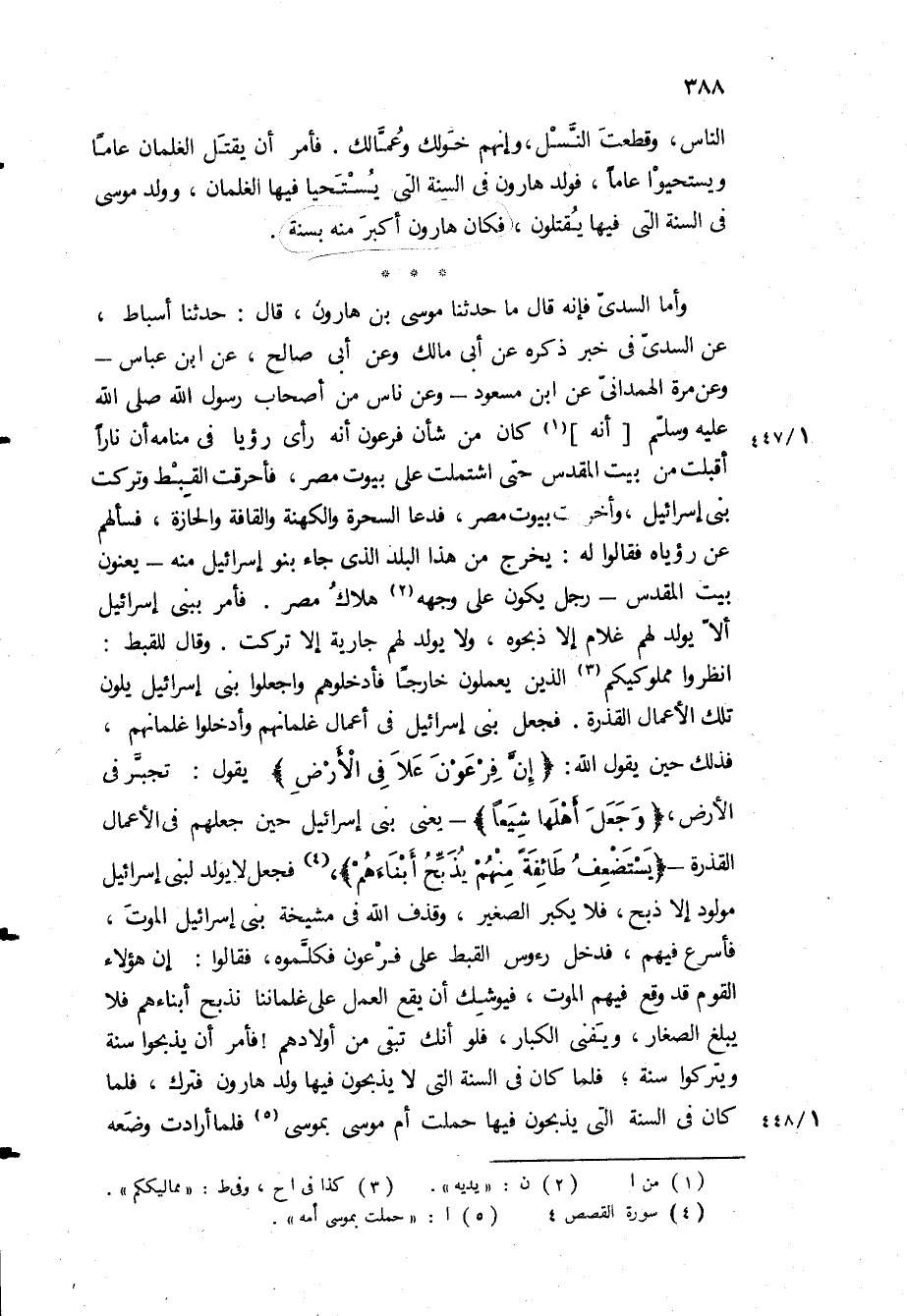 فَذَلِكَ حِينَ يَقُولُ الله: «إِنَّ فِرْعَوْنَ عَلا فِي الْأَرْضِ» يَقُولُ: تَجَبَّرَ فِي الأَرْضِ، «وَجَعَلَ أَهْلَها شِيَعاً» - يَعْنِي بَنِي إِسْرَائِيلَ حِينَ جَعَلَهُمْ فِي الأَعْمَالِ القذره- «يَسْتَضْعِفُ طائِفَةً مِنْهُمْ يُذَبِّحُ أَبْناءَهُمْ» ، فَجَعَلَ لا يُولَدُ لِبَنِي إِسْرَائِيلَ مَوْلُودٌ إِلا ذُبِحَ، فَلا يَكْبُرُ الصَّغِيرُ، وَقَذَفَ اللَّهُ فِي مَشْيَخَةِ بَنِي إِسْرَائِيلَ الْمَوْتَ، فَأَسْرَعَ فِيهِمْ، فَدَخَلَ رُءُوسُ الْقِبْطِ عَلَى فِرْعَوْنَ فَكَلَّمُوهُ، فَقَالُوا: إِنَّ هَؤُلاءِ الْقَوْمَ قَدْ وَقَعَ فِيهِمُ الْمَوْتُ، فَيُوشِكُ أَنْ يَقَعَ الْعَمَلُ عَلَى غِلْمَانِنَا نُذَبِّحُ أَبْنَاءَهُمْ فلا يبلغ الصغار، ويفنى الْكِبَارَ، فَلَوْ أَنَّكَ تُبْقِي مِنْ أَوْلادِهِمْ! فَأَمَرَ أَنْ يُذْبَحُوا سَنَةً وَيُتْرَكُوا سَنَةً، فَلَمَّا كَانَ فِي السَّنَةِ الَّتِي لا يُذْبَحُونَ فِيهَا وُلِدَ هَارُونُ فَتُرِكَ، فَلَمَّا كَانَ فِي السَّنَةِ الَّتِي يُذْبَحُونَ فِيهَا حَمَلَتْ أُمُّ مُوسَى بِمُوسَى فَلَمَّا ارادت وضعه