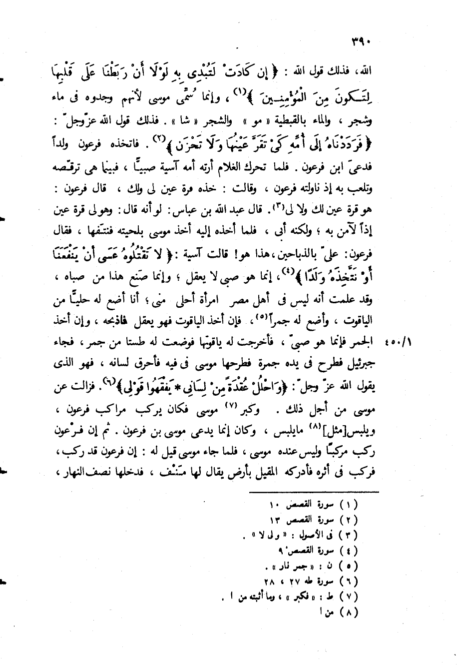 هُوَ قُرَّةُ عَيْنٍ لَكِ وَلا لِي قَالَ عَبْدُ اللَّهِ بْنُ عَبَّاسٍ: لَوْ أَنَّهُ قَالَ: وَهُوَ لِي قُرَّةُ عَيْنٍ إِذًا لآمَنَ بِهِ، وَلَكِنَّهُ أَبَى، فَلَمَّا أَخَذَهُ إِلَيْهِ أَخَذَ موسى بِلِحْيَتِهِ فَنَتَفَهَا، فَقَالَ فِرْعَوْنُ: عَلَيَّ بِالذَّبَّاحِينَ، هَذَا هُوَ! قَالَتْ آسِيَةُ: «لا تَقْتُلُوهُ عَسى أَنْ يَنْفَعَنا أَوْ نَتَّخِذَهُ وَلَداً» ، انما هُوَ صَبِيٌّ لا يَعْقِلُ، وَإِنَّمَا صَنَعَ هَذَا مِنْ صِبَاهُ، وَقَدْ عَلِمْتَ أَنَّهُ لَيْسَ فِي أَهْلِ مِصْرَ امْرَأَةٌ أَحْلَى مِنِّي، أَنَا أَضَعُ له حليا مِنَ الْيَاقُوتِ، وَأَضَعُ لَهُ جَمْرًا، فَإِنْ أَخَذَ الْيَاقُوتَ فَهُوَ يَعْقِلُ فَاذْبَحْهُ، وَإِنْ أَخَذَ الْجَمْرَ فَإِنَّمَا هُوَ صَبِيٌّ، فَأَخْرَجَتْ لَهُ يَاقُوتَهَا فَوَضَعَتْ له طستا من جمر، فجاء جبرئيل فَطَرَحَ فِي يَدِهِ جَمْرَةً فَطَرَحَهَا موسى فِي فِيهِ فَأَحْرَقَ لِسَانَهُ، فَهُوَ الَّذِي يَقُولُ اللَّهُ عَزَّ وَجَلَّ: «وَاحْلُلْ عُقْدَةً مِنْ لِسانِي يَفْقَهُوا قَوْلِي» فَزَالَتْ عَنْ مُوسَى مِنْ أَجْلِ ذَلِكَ وَكَبُرَ مُوسَى فَكَانَ يَرْكَبُ مَرَاكِبَ فِرْعَوْنَ، وَيَلْبَسُ مِثْلَ ما يلبس، وكان انما يدعى موسى بن فِرْعَوْنَ ثَمَّ إِنَّ فِرْعَوْنَ رَكِبَ مَرْكَبًا وَلَيْسَ عِنْدَهُ مُوسَى، فَلَمَّا جَاءَ مُوسَى قِيلَ لَهُ: إِنَّ فِرْعَوْنَ قَدْ رَكِبَ، فَرَكِبَ فِي أَثَرِهِ فَأَدْرَكَهُ الْمَقِيلُ بِأَرْضٍ يُقَالُ لَهَا مَنْفُ، فَدَخَلَهَا نصف النهار،