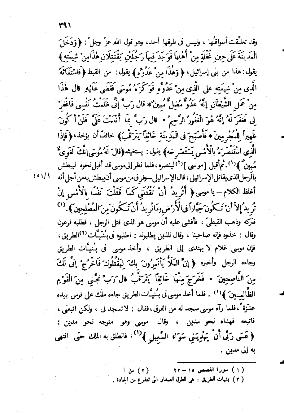 وقد تعلقت أَسْوَاقُهَا وَلَيْسَ فِي طُرُقِهَا أَحَدٌ وَهُوَ قَوْلُ اللَّهِ عَزَّ وَجَلَّ: «وَدَخَلَ الْمَدِينَةَ عَلى حِينِ غَفْلَةٍ مِنْ أَهْلِها فَوَجَدَ فِيها رَجُلَيْنِ يَقْتَتِلانِ هَذَا مِنْ شِيعَتِهِ يَقُولُ: هَذَا مِنْ بَنِي إِسْرَائِيلَ، وَهذا مِنْ عَدُوِّهِ يقول: من القبط فَاسْتَغاثَهُ الَّذِي مِنْ شِيعَتِهِ عَلَى الَّذِي مِنْ عَدُوِّهِ فَوَكَزَهُ مُوسى فَقَضى عَلَيْهِ قالَ هَذَا مِنْ عَمَلِ الشَّيْطانِ إِنَّهُ عَدُوٌّ مُضِلٌّ مُبِينٌ قالَ رَبِّ إِنِّي ظَلَمْتُ نَفْسِي فَاغْفِرْ لِي فَغَفَرَ لَهُ إِنَّهُ هُوَ الْغَفُورُ الرَّحِيمُ قالَ رَبِّ بِما أَنْعَمْتَ عَلَيَّ فَلَنْ أَكُونَ ظَهِيراً لِلْمُجْرِمِينَ فَأَصْبَحَ فِي الْمَدِينَةِ خائِفاً يَتَرَقَّبُ» خَائِفًا أَنْ يُؤْخَذَ، «فَإِذَا الَّذِي اسْتَنْصَرَهُ بِالْأَمْسِ يَسْتَصْرِخُهُ» يَقُولُ: يَسْتَغِيثُهُ «قالَ لَهُ مُوسى إِنَّكَ لَغَوِيٌّ مُبِينٌ» ثُمَّ أَقْبَلَ مُوسَى لِيَنْصُرَهُ فَلَمَّا نَظَرَ إِلَى مُوسَى قَدْ أَقْبَلَ نَحْوَهُ لِيَبْطِشَ بِالرَّجُلِ الَّذِي يُقَاتِلُ الإِسْرَائِيلِيَّ، قَالَ الإِسْرَائِيلِيُّ- وَفَرَقَ مِنْ مُوسَى أَنْ يَبْطِشَ بِهِ مِنْ أَجْلِ أَنَّهُ أَغْلَظَ الْكَلامَ- يَا مُوسَى «أَتُرِيدُ أَنْ تَقْتُلَنِي كَما قَتَلْتَ نَفْساً بِالْأَمْسِ إِنْ تُرِيدُ إِلَّا أَنْ تَكُونَ جَبَّاراً فِي الْأَرْضِ وَما تُرِيدُ أَنْ تَكُونَ مِنَ الْمُصْلِحِينَ» .