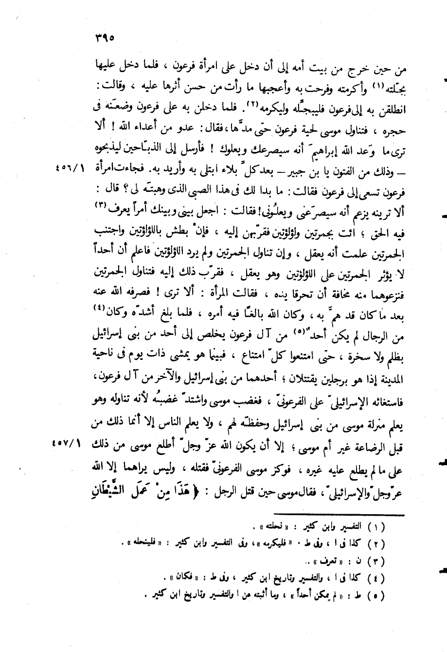 أَلَا تَرَيْنَهُ يَزْعُمُ أَنَّهُ سَيَصْرَعُنِي وَيَعْلُونِي! فَقَالَتِ: اجْعَلْ بَيْنِي وَبَيْنَكَ أَمْرًا يُعْرَفُ فِيهِ الْحَقُّ، ائْتِ بِجَمْرَتَيْنِ وَلُؤْلُؤَتَيْنِ فَقَرِّبْهُنَّ إِلَيْهِ، فَإِنْ بَطَشَ بِاللُّؤْلُؤَتَيْنِ وَاجْتَنَبَ الْجَمْرَتَيْنِ عَلِمْتُ أَنَّهُ يَعْقِلُ، وَإِنْ تَنَاوَلَ الْجَمْرَتَيْنِ وَلَمْ يُرِدِ اللُّؤْلُؤَتَيْنِ فَاعْلَمْ أَنَّ أَحَدًا لَا يُؤْثِرُ الْجَمْرَتَيْنِ عَلَى اللُّؤْلُؤَتَيْنِ وَهُوَ يَعْقِلُ، فَقَرَّبَ ذَلِكَ إِلَيْهِ فَتَنَاوَلَ الْجَمْرَتَيْنِ فَنَزَعُوهُمَا مِنْهُ مَخَافَةَ أَنْ تُحْرِقَا يَدَهُ، فَقَالَتِ الْمَرْأَةُ: أَلَا تَرَى! فَصَرَفَهُ اللَّهُ عَنْهُ بَعْدَ مَا كَانَ قَدْ هَمَّ بِهِ، وَكَانَ اللَّهُ بَالِغًا فِيهِ أَمْرَهُ، فَلَمَّا بَلَغَ أَشُدَّهُ وَكَانَ مِنَ الرِّجَالِ لَمْ يَكُنْ أَحَدٌ مِنْ آلِ فِرْعَوْنَ يَخْلُصُ إِلَى أَحَدٍ مِنْ بَنِي إِسْرَائِيلَ بِظُلْمٍ وَلَا سُخْرَةٍ، حَتَّى امْتَنَعُوا كُلَّ امْتِنَاعٍ، فَبَيْنَمَا هُوَ يَمْشِي ذَاتَ يَوْمٍ فِي نَاحِيَةِ الْمَدِينَةِ إِذَا هُوَ بِرَجُلَيْنِ يَقْتَتِلانِ، أَحَدُهُمَا مِنْ بَنِي إِسْرَائِيلَ وَالآخَرُ مِنْ آلِ فِرْعَوْنَ، فَاسْتَغَاثَهُ الإِسْرَائِيلِيُّ عَلَى الْفِرْعَوْنِيِّ، فَغَضِبَ مُوسَى وَاشْتَدَّ غَضَبُهُ لِأَنَّهُ تَنَاوَلَهُ وَهُوَ يَعْلَمُ مَنْزِلَةَ مُوسَى مِنْ بَنِي إِسْرَائِيلَ وَحِفْظَهُ لَهُمْ، وَلَا يَعْلَمُ النَّاسُ إِلَّا أَنَّمَا ذَلِكَ مِنْ قِبَلِ الرَّضَاعَةِ غَيْرَ أُمِّ مُوسَى، إِلَّا أَنْ يَكُونَ اللَّهُ عَزَّ وَجَلَّ أَطْلَعَ مُوسَى مِنْ ذلك على ما لم يُطْلِعُ عَلَيْهِ غَيْرَهُ، فَوَكَزَ مُوسَى الْفِرْعَوْنِيَّ فَقَتَلَهُ، وَلَيْسَ يَرَاهُمَا إِلَّا اللَّهُ عَزَّ وَجَلَّ وَالْإِسْرَائِيلِيُّ، فَقَالَ مُوسَى حِينَ قَتَلَ الرَّجُلَ: «هَذَا مِنْ عَمَلِ الشَّيْطانِ