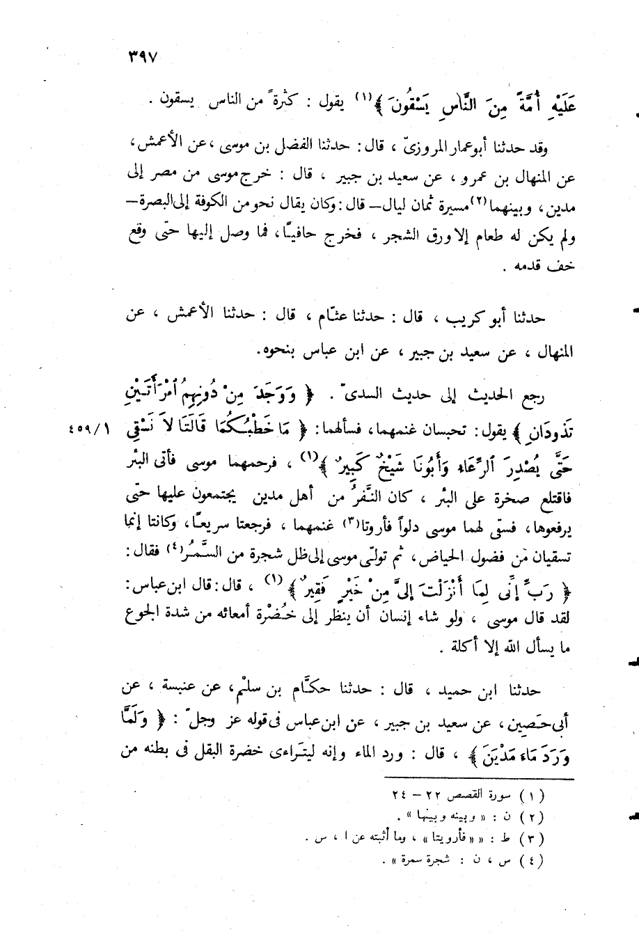 حَدَّثَنَا ابْنُ حُمَيْدٍ، قَالَ: حَدَّثَنَا حَكَّامُ بْنُ سَلْمٍ، عَنْ عَنْبَسَةَ، عَنْ أَبِي حُصَيْنٍ، عَنْ سَعِيدِ بْنِ جُبَيْرٍ، عَنِ ابْنِ عَبَّاسٍ فِي قَوْلِهِ عَزَّ وَجَلَّ: «وَلَمَّا وَرَدَ ماءَ مَدْيَنَ» ، قَالَ: وَرَدَ الْمَاءَ وَإِنَّهُ لَيَتَرَاءَى خَضِرَةَ الْبَقْلِ فِي بَطْنِهِ مِنَ