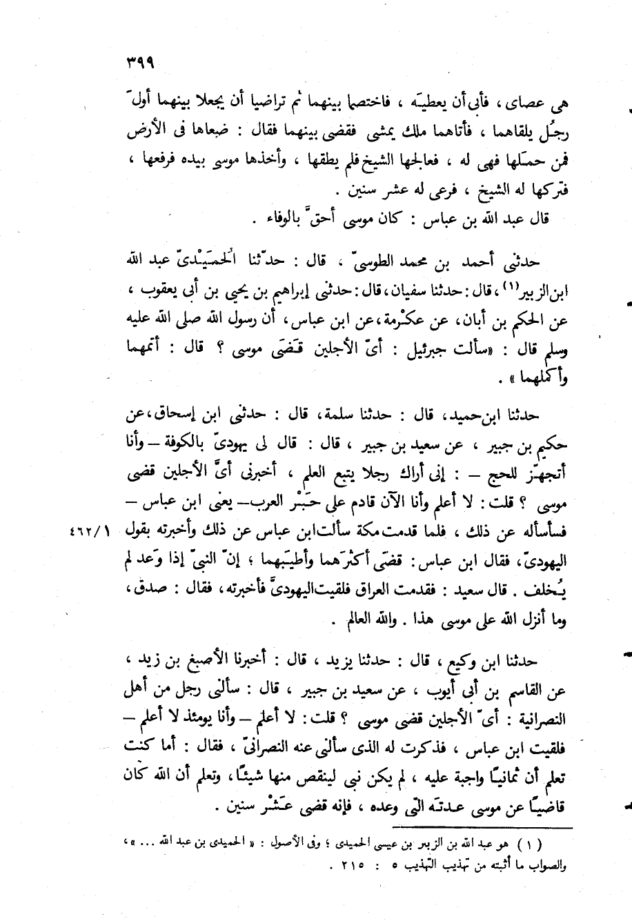 حَدَّثَنِي أَحْمَدُ بْنُ مُحَمَّدٍ الطوسى، قال: حدثنا الحميدى عبد الله ابن الزُّبَيْرِ، قَالَ: حَدَّثَنَا سُفْيَانُ، قَالَ: حَدَّثَنِي إِبْرَاهِيمُ بْنُ يَحْيَى بْنِ أَبِي يَعْقُوبَ، عَنِ الْحَكَمِ بْنِ أَبَانٍ، عَنْ عِكْرِمَةَ، عَنِ ابْنِ عَبَّاسٍ، [أَنَّ رَسُولَ الله ص قال: سالت جبرئيل: أَيُّ الأَجَلَيْنِ قَضَى مُوسَى؟ قَالَ: أَتَمَّهُمَا وَأَكْمَلَهُمَا] .