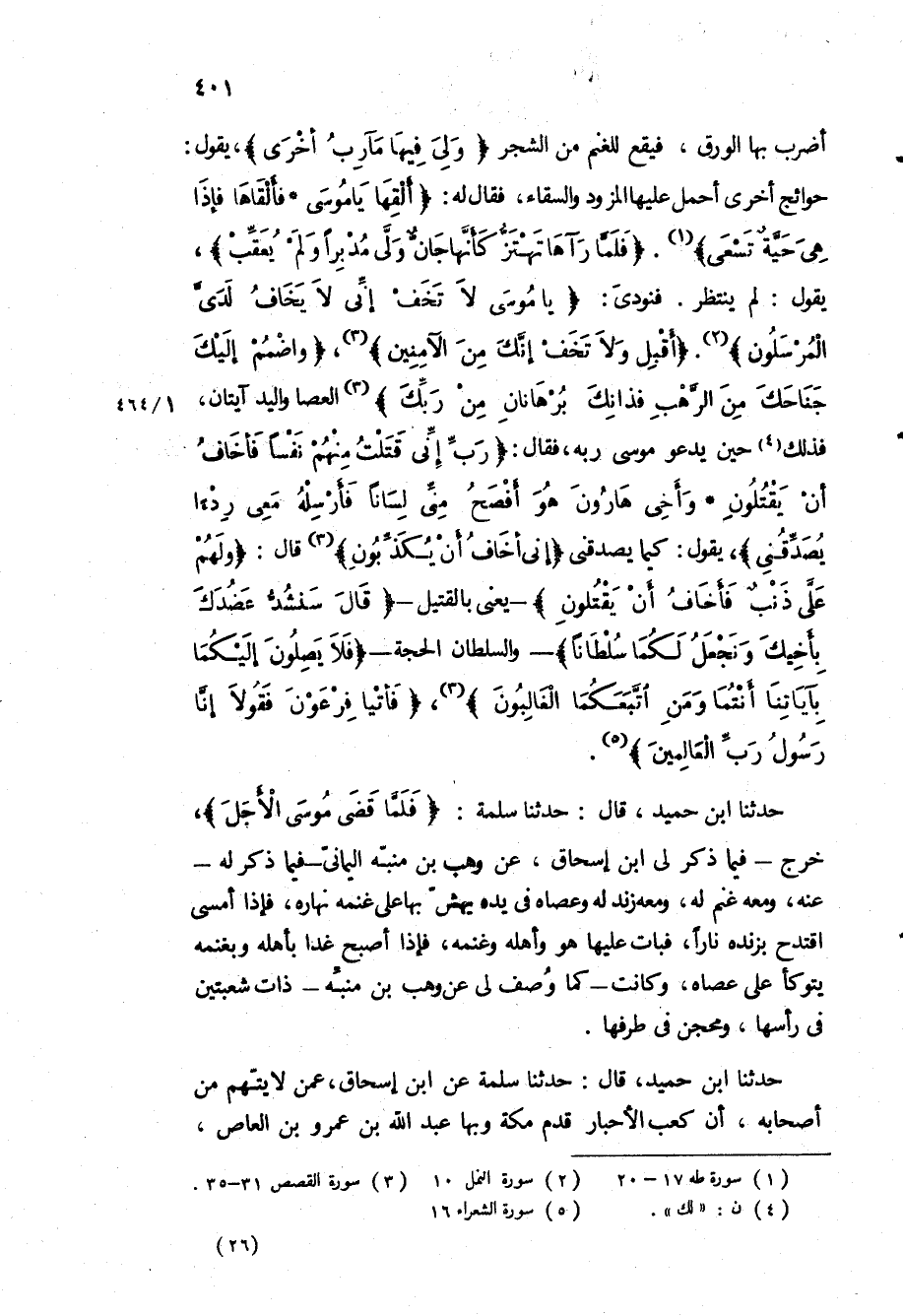 حَوَائِجُ أُخْرَى أَحْمِلُ عَلَيْهَا الْمِزْوَدَ وَالسِّقَاءَ، فَقَالَ لَهُ: «أَلْقِها يَا مُوسى فَأَلْقاها فَإِذا هِيَ حَيَّةٌ تَسْعى» «فَلَمَّا رَآها تَهْتَزُّ كَأَنَّها جَانٌّ وَلَّى مُدْبِراً وَلَمْ يُعَقِّبْ» ، يَقُولُ: لَمْ يَنْتَظِرْ فَنُودِيَ: «يَا مُوسى لا تَخَفْ إِنِّي لا يَخافُ لَدَيَّ الْمُرْسَلُونَ» «أَقْبِلْ وَلا تَخَفْ إِنَّكَ مِنَ الْآمِنِينَ» ، «وَاضْمُمْ إِلَيْكَ جَناحَكَ مِنَ الرَّهْبِ فَذانِكَ بُرْهانانِ مِنْ رَبِّكَ» الْعَصَا وَالْيَدُ آيَتَانِ، فَذَلِكَ حِينَ يَدْعُو مُوسَى رَبَّهُ، فَقَالَ: «رَبِّ إِنِّي قَتَلْتُ مِنْهُمْ نَفْساً فَأَخافُ أَنْ يَقْتُلُونِ وَأَخِي هارُونُ هُوَ أَفْصَحُ مِنِّي لِساناً فَأَرْسِلْهُ مَعِي رِدْءاً يُصَدِّقُنِي» ، يَقُولُ: كَيْمَا يُصَدِّقُنِي «إِنِّي أَخافُ أَنْ يُكَذِّبُونِ» قَالَ: «وَلَهُمْ عَلَيَّ ذَنْبٌ فَأَخافُ أَنْ يَقْتُلُونِ» - يَعْنِي بِالْقَتِيلِ- «قالَ سَنَشُدُّ عَضُدَكَ بِأَخِيكَ وَنَجْعَلُ لَكُما سُلْطاناً» - وَالسُّلْطَانُ الْحُجَّةُ- «فَلا يَصِلُونَ إِلَيْكُما بِآياتِنا أَنْتُما وَمَنِ اتَّبَعَكُمَا الْغالِبُونَ» ، «ْتِيا فِرْعَوْنَ فَقُولا إِنَّا رَسُولُ رَبِّ الْعالَمِينَ