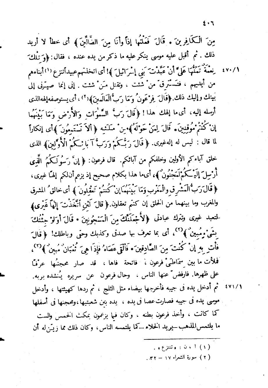 مِنَ الْكافِرِينَ قالَ فَعَلْتُها إِذاً وَأَنَا مِنَ الضَّالِّينَ» أي خطأ لا أريد ذلك ثم أقبل عليه موسى ينكر عليه ما ذكر من يده عنده، فقال: «وَتِلْكَ نِعْمَةٌ تَمُنُّها عَلَيَّ أَنْ عَبَّدْتَ بَنِي إِسْرائِيلَ» ! أي اتخذتهم عبيدا تنزع أبناءهم من أيديهم، فتسترق من شئت، وتقتل من شئت إني إنما صيرني إلى بيتك وإليك ذلك «قالَ فِرْعَوْنُ وَما رَبُّ الْعالَمِينَ» ، أي يستوصفه إلهه الذي أرسله إليه، أي ما الهك هذا! «قالَ رَبُّ السَّماواتِ وَالْأَرْضِ وَما بَيْنَهُمَا إِنْ كُنْتُمْ مُوقِنِينَ قالَ لِمَنْ حَوْلَهُ» من ملئه «أَلا تَسْتَمِعُونَ» أي إنكارا لما قَالَ: ليس له إله غيرى «قالَ رَبُّكُمْ وَرَبُّ آبائِكُمُ الْأَوَّلِينَ» الذي خلق آباءكم الأولين وخلفكم من آبائكم قَالَ فرعون: «إِنَّ رَسُولَكُمُ الَّذِي أُرْسِلَ إِلَيْكُمْ لَمَجْنُونٌ» ، أي ما هذا بكلام صحيح إذ يزعم أن لكم إلها غيري، «قالَ رَبُّ الْمَشْرِقِ وَالْمَغْرِبِ وَما بَيْنَهُما إِنْ كُنْتُمْ تَعْقِلُونَ» أي خالق المشرق والمغرب وما بينهما من الخلق إن كنتم تعقلون «قالَ لَئِنِ اتَّخَذْتَ إِلهَاً غَيْرِي» لتعبد غيري وتترك عبادتي «لَأَجْعَلَنَّكَ مِنَ الْمَسْجُونِينَ قالَ أَوَلَوْ جِئْتُكَ بِشَيْءٍ مُبِينٍ» ، أي بما تعرف بها صدقي وكذبك وحقي وباطلك! «لَ فَأْتِ بِهِ إِنْ كُنْتَ مِنَ الصَّادِقِينَ فَأَلْقى عَصاهُ فَإِذا هِيَ ثُعْبانٌ مُبِينٌ