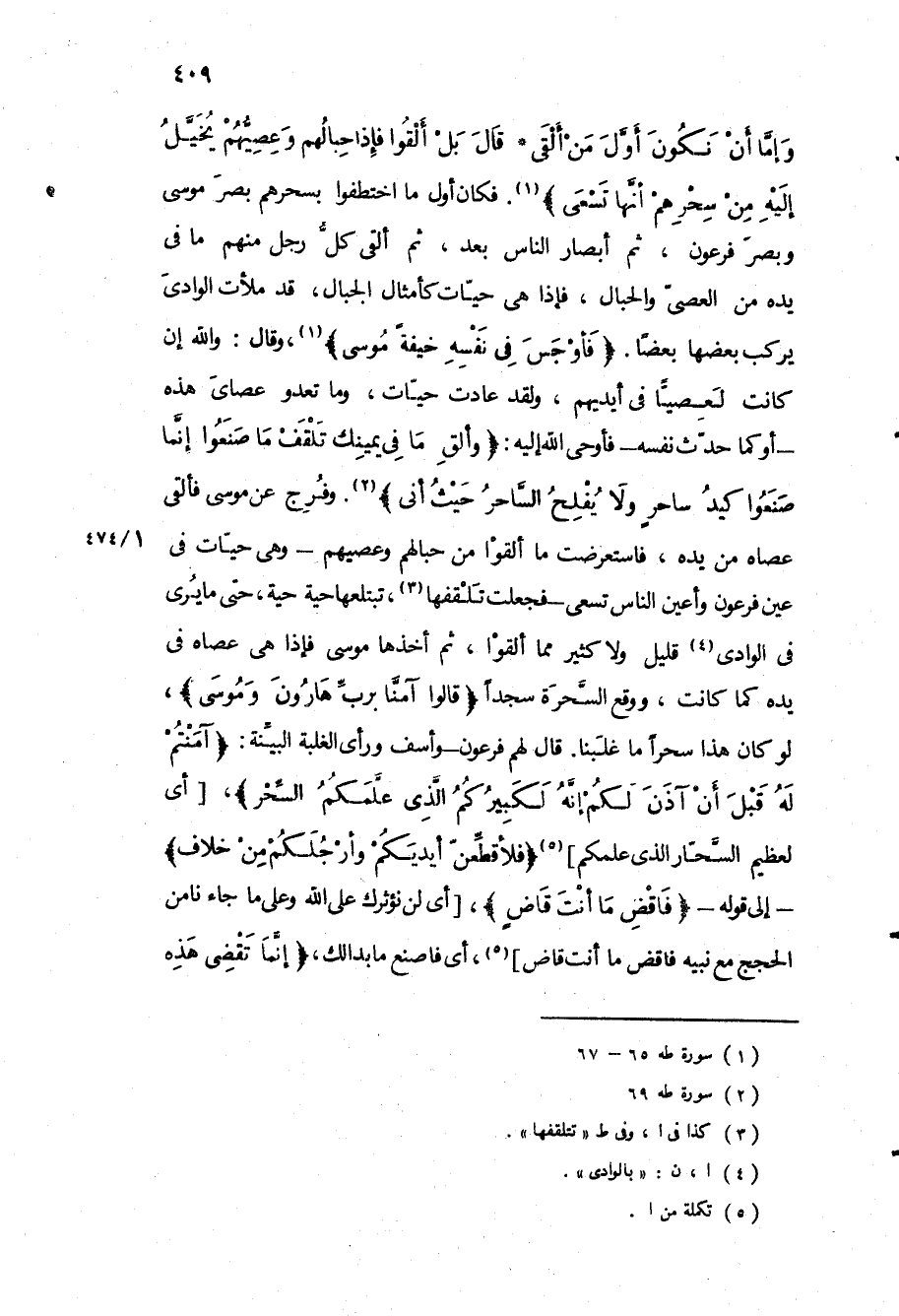 وَإِمَّا أَنْ نَكُونَ أَوَّلَ مَنْ أَلْقى قالَ بَلْ أَلْقُوا فَإِذا حِبالُهُمْ وَعِصِيُّهُمْ يُخَيَّلُ إِلَيْهِ مِنْ سِحْرِهِمْ أَنَّها تَسْعى» فكان أول ما اختطفوا بسحرهم بصر موسى وبصر فرعون، ثم أبصار الناس بعد، ثم ألقى كل رجل منهم ما في يده من العصي والحبال، فإذا هي حيات كأمثال الجبال، قد ملأت الوادي يركب بعضها بعضا «فَأَوْجَسَ فِي نَفْسِهِ خِيفَةً مُوسى» ، وقال: والله إن كانت لعصيا في أيديهم، ولقد عادت حيات، وما تعدو عصاي هذه- أو كما حدث نفسه- فأوحى الله إليه: «وَأَلْقِ مَا فِي يَمِينِكَ تَلْقَفْ مَا صَنَعُوا إِنَّما صَنَعُوا كَيْدُ ساحِرٍ وَلا يُفْلِحُ السَّاحِرُ حَيْثُ أَتى» وفرج عن موسى فألقى عصاه من يده، فاستعرضت ما ألقوا من حبالهم وعصيهم- وهي حيات في عين فرعون وأعين الناس تسعى- فجعلت تلقفها، تبتلعها حية حية، حتى ما يرى في الوادي قليل ولا كثير مما ألقوا، ثم أخذها موسى فإذا هي عصاه في يده كما كانت، ووقع السحرة سجدا «قالُوا آمَنَّا بِرَبِّ هارُونَ وَمُوسى» ، لو كان هذا سحرا ما غلبنا قَالَ لهم فرعون- وأسف ورأى الغلبة البينة: «آمَنْتُمْ لَهُ قَبْلَ أَنْ آذَنَ لَكُمْ إِنَّهُ لَكَبِيرُكُمُ الَّذِي عَلَّمَكُمُ السِّحْرَ» ، أي لعظيم السحار الذي علمكم «فَلَأُقَطِّعَنَّ أَيْدِيَكُمْ وَأَرْجُلَكُمْ مِنْ خِلافٍ» - إلى قوله- «فَاقْضِ مَا أَنْتَ قاضٍ» ، اى لن نؤثرك على الله وعلى ما جاءنا من الحجج مع نبيه فاقض ما أنت قاض، أي فاصنع ما بدا لك، «إِنَّما تَقْضِي هذِهِ