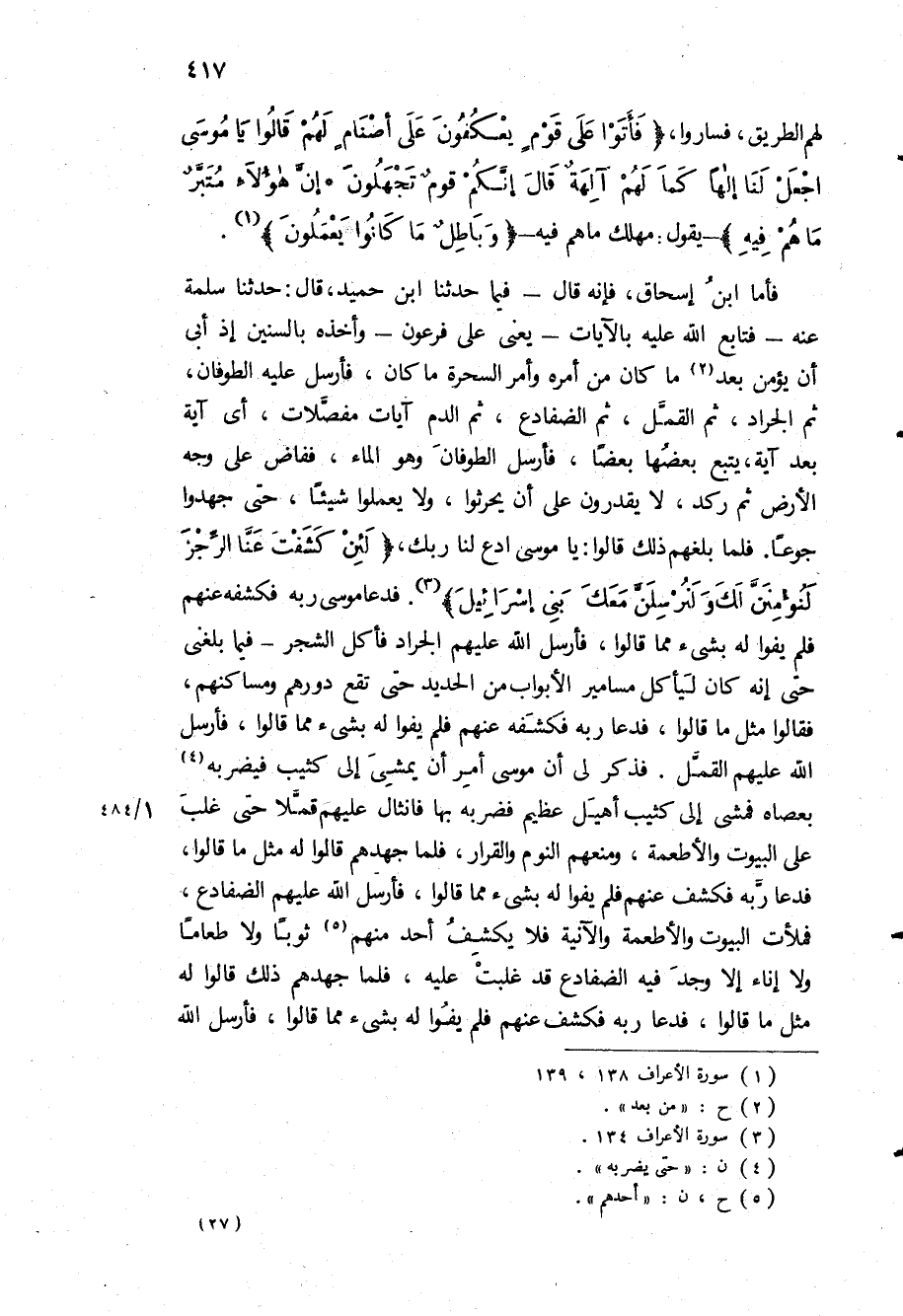 لهم الطريق، فساروا، «فَأَتَوْا عَلى قَوْمٍ يَعْكُفُونَ عَلى أَصْنامٍ لَهُمْ قالُوا يَا مُوسَى اجْعَلْ لَنا إِلهاً كَما لَهُمْ آلِهَةٌ قالَ إِنَّكُمْ قَوْمٌ تَجْهَلُونَ إِنَّ هؤُلاءِ مُتَبَّرٌ مَا هُمْ فِيهِ» - يقول: مهلك ما هم فيه- «وَباطِلٌ مَا كانُوا يَعْمَلُونَ» فأما ابْنُ إِسْحَاقَ، فَإِنَّهُ قَالَ- فِيمَا حَدَّثَنَا ابْنُ حميد، قَالَ: حَدَّثَنَا سلمة عنه- فتابع الله عليه بالآيات- يعني على فرعون- وأخذه بالسنين إذ أبى أن يؤمن بعد ما كان من أمره وأمر السحرة ما كان، فأرسل عليه الطوفان، ثم الجراد، ثم القمل، ثم الضفادع، ثم الدم آيات مفصلات، أي آية بعد آية، يتبع بعضها بعضا، فأرسل الطوفان وهو الماء، ففاض على وجه الأرض ثم ركد، لا يقدرون على أن يحرثوا، ولا يعملوا شيئا، حتى جهدوا جوعا فلما بلغهم ذلك قَالُوا: يَا مُوسَى ادْعُ لنا ربك، «لَئِنْ كَشَفْتَ عَنَّا الرِّجْزَ لَنُؤْمِنَنَّ لَكَ وَلَنُرْسِلَنَّ مَعَكَ بَنِي إِسْرائِيلَ» فدعا موسى ربه فكشفه عنهم فلم يفوا له بشيء مما قَالُوا، فأرسل الله عليهم الجراد فأكل الشجر- فيما بلغني حتى إنه كان ليأكل مسامير الأبواب من الحديد حتى تقع دورهم ومساكنهم، فقالوا مثل ما قَالُوا، فدعا ربه فكشفه عنهم فلم يفوا له بشيء مما قالوا، فأرسل الله عليهم القمل فذكر لي أن موسى أمر أن يمشي إلى كثيب فيضربه بعصاه فمشى إلى كثيب أهيل عظيم فضربه بها فانثال عليهم قملا حتى غلب على البيوت والأطعمة، ومنعهم النوم والقرار، فلما جهدهم قَالُوا له مثل ما قَالُوا، فدعا ربه فكشف عنهم فلم يفوا له بشيء مما قَالُوا، فأرسل الله عليهم الضفادع، فملأت البيوت والأطعمة والآنية فلا يكشف أحد منهم ثوبا ولا طعاما ولا إناء إلا وجد فيه الضفادع قد غلبت عليه، فلما جهدهم ذلك قَالُوا له مثل ما قَالُوا، فدعا ربه فكشف عنهم فلم يفوا له بشيء مما قَالُوا، فأرسل الله
