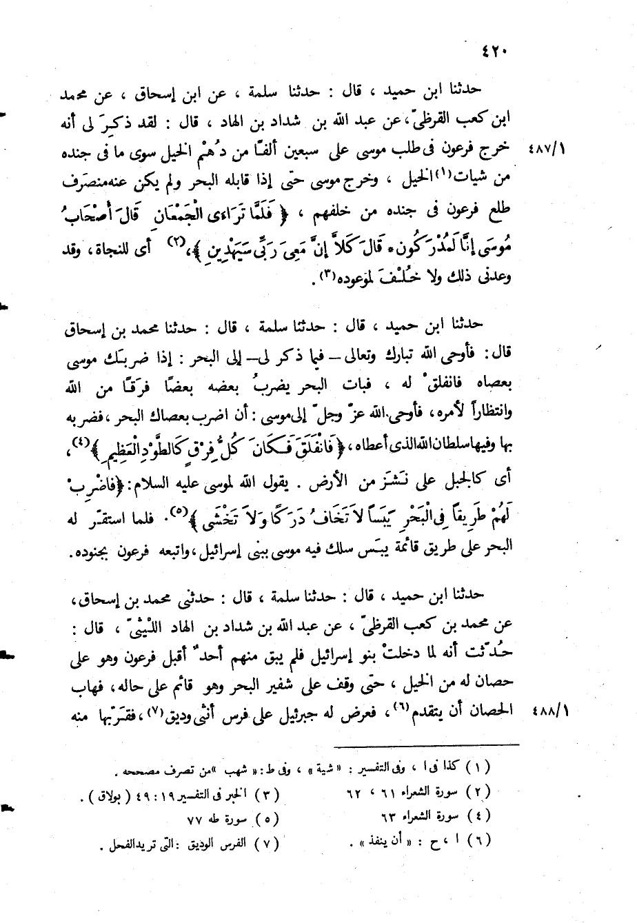 حَدَّثَنَا ابن حميد، قال: حَدَّثَنَا سلمة، عن ابن إسحاق، عن محمد ابن كعب القرظي، عن عبد الله بن شداد بن الهاد، قَالَ: لقد ذكر لي أنه خرج فرعون في طلب موسى على سبعين ألفا من دهم الخيل سوى ما في جنده من شيات الخيل، وخرج موسى حتى إذا قابله البحر ولم يكن عنه منصرف طلع فرعون في جنده من خلفهم، «فَلَمَّا تَراءَا الْجَمْعانِ قالَ أَصْحابُ مُوسى إِنَّا لَمُدْرَكُونَ قالَ كَلَّا إِنَّ مَعِي رَبِّي سَيَهْدِينِ» ، أي للنجاة، وقد وعدني ذلك ولا خلف لموعوده.