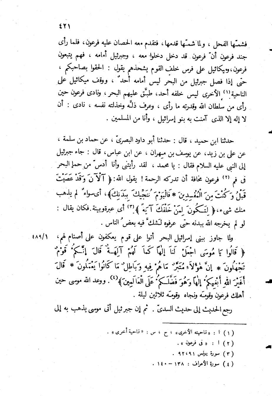 حَدَّثَنَا ابْنُ حُمَيْدٍ، قَالَ: حَدَّثَنَا أَبُو دَاوُدَ الْبَصْرِيُّ، عَنْ حَمَّادِ بْنِ سَلَمَةَ، عَنْ عَلِيِّ بْنِ زَيْدٍ، عَنْ يُوسُفَ بْنِ مِهْرَانَ عَنِ ابن عباس، قال: جاء جبرئيل الى النبي ع فَقَالَ: يَا مُحَمَّدُ، لَقَدْ رَأَيْتُنِي وَأَنَا أَدُسُّ مِنْ حَمَإِ الْبَحْرِ فِي فَمِ فِرْعَوْنَ مَخَافَةَ ان تدركه الرحمه! يقول الله: «آلْآنَ وَقَدْ عَصَيْتَ قَبْلُ وَكُنْتَ مِنَ الْمُفْسِدِينَ فَالْيَوْمَ نُنَجِّيكَ بِبَدَنِكَ» ، اى سواء لَمْ يَذْهَبْ مِنْكَ شَيْءٌ، «لِتَكُونَ لِمَنْ خَلْفَكَ آيَةً» أَيْ عِبْرَةً وَبَيِّنَةً فَكَانَ يُقَالُ: