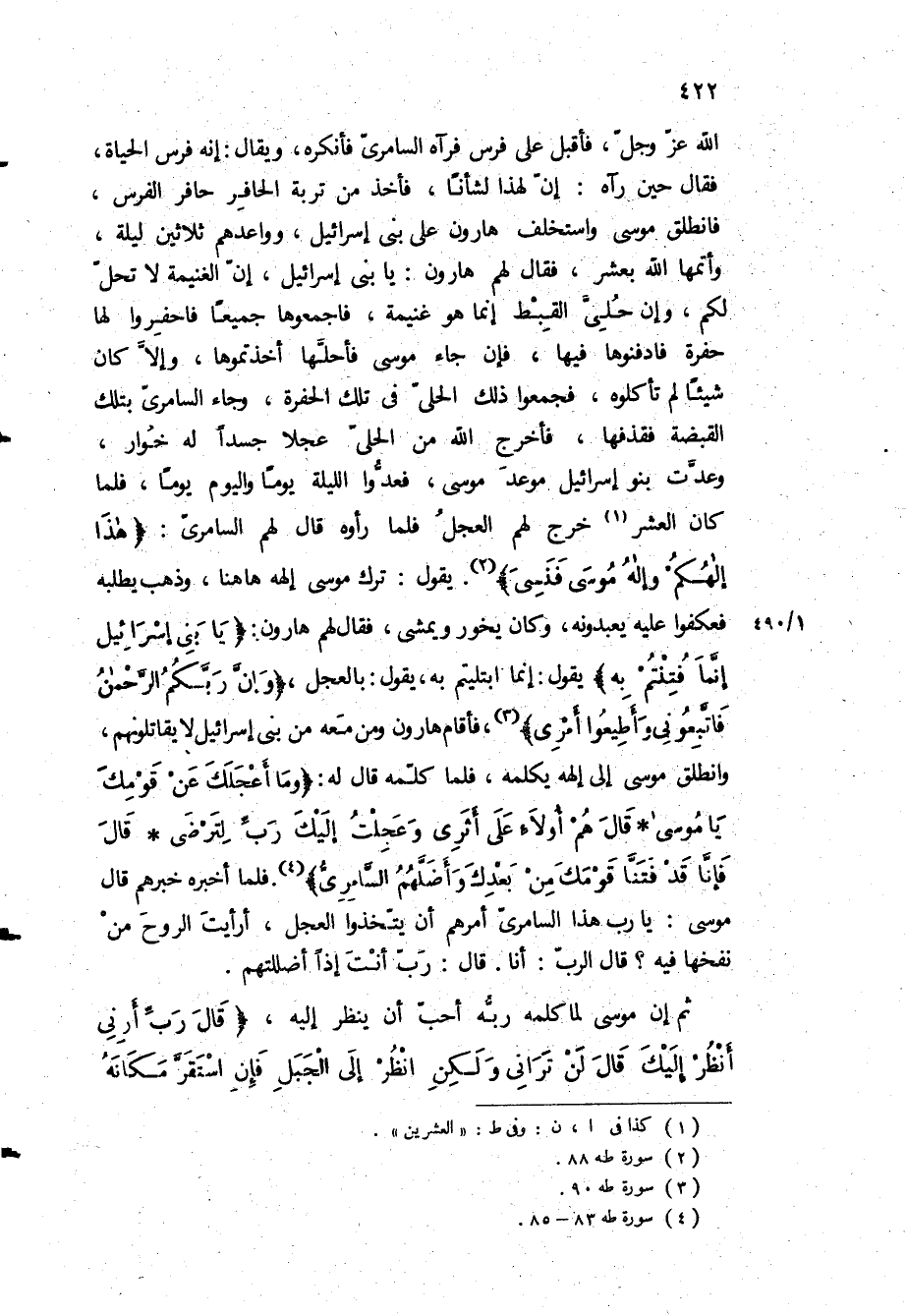 اللَّهِ عَزَّ وَجَلَّ، فَأَقْبَلَ عَلَى فَرَسٍ فَرَآهُ السَّامِرِيُّ فَأَنْكَرَهُ، وَيُقَالُ: إِنَّهُ فَرَسُ الْحَيَاةِ، فَقَالَ حِينَ رَآهُ: إِنَّ لِهَذَا لَشَأْنًا، فَأَخَذَ مِنْ تُرْبَةِ الْحَافِرِ حَافِرِ الْفَرَسِ، فَانْطَلَقَ مُوسَى وَاسْتَخْلَفَ هَارُونَ عَلَى بَنِي إِسْرَائِيلَ، وَوَاعَدَهُمْ ثَلَاثِينَ لَيْلَةً، وَأَتَمَّهَا اللَّهُ بِعَشْرٍ، فَقَالَ لَهُمْ هَارُونُ: يَا قوم، إِنَّ الْغَنِيمَةَ لَا تَحِلُّ لَكُمْ، وَإِنَّ حُلِيَّ الْقِبْطِ إِنَّمَا هُوَ غَنِيمَةٌ، فَاجْمَعُوهَا جَمِيعًا فَاحْفِرُوا لَهَا حُفْرَةً فَادْفِنُوهَا فِيهَا، فَإِنْ جَاءَ مُوسَى فَأَحَلَّهَا أَخَذْتُمُوهَا، وَإِلَّا كَانَ شَيْئًا لَمْ تَأْكُلُوهُ، فَجَمَعُوا ذَلِكَ الْحُلِيَّ فِي تِلْكَ الْحُفْرَةِ، وَجَاءَ السامرى بتلك القبضه فقذفها، فاخرج الله مِنَ الْحُلِيِّ عِجْلًا جَسَدًا لَهُ خُوَارٌ، وَعَدَّتْ بَنُو إِسْرَائِيلَ مَوْعِدَ مُوسَى، فَعَدُّوا اللَّيْلَةَ يَوْمًا واليوم يوما، فلما كان العشر خرج لهم العجل فَلَمَّا رَأَوْهُ قَالَ لَهُمُ السَّامِرِيُّ: «هَذَا إِلهُكُمْ وَإِلهُ مُوسى فَنَسِيَ» يقول: ترك موسى إلهه هاهنا، وَذَهَبَ يَطْلُبُهُ فَعَكَفُوا عَلَيْهِ يَعْبُدُونَهُ، وَكَانَ يَخُورُ وَيَمْشِي، فَقَالَ لَهُمْ هَارُونُ: «يَا بَنِي إِسْرَائِيلَ إِنَّما فُتِنْتُمْ بِهِ» يَقُولُ: إِنَّمَا ابْتُلِيتُمْ بِهِ، يَقُولُ: بِالْعِجْلِ، «وَإِنَّ رَبَّكُمُ الرَّحْمنُ فَاتَّبِعُونِي وَأَطِيعُوا أَمْرِي» ، فَأَقَامَ هَارُونُ وَمَنْ مَعَهُ مِنْ بَنِي إِسْرَائِيلَ لَا يُقَاتِلُونَهُمْ، وَانْطَلَقَ مُوسَى إِلَى إِلَهِهِ يُكَلِّمُهُ، فَلَمَّا كَلَّمَهُ قَالَ لَهُ: «وَما أَعْجَلَكَ عَنْ قَوْمِكَ يَا مُوسى قالَ هُمْ أُولاءِ عَلى أَثَرِي وَعَجِلْتُ إِلَيْكَ رَبِّ لِتَرْضى قالَ فَإِنَّا قَدْ فَتَنَّا قَوْمَكَ مِنْ بَعْدِكَ وَأَضَلَّهُمُ السَّامِرِيُّ» فَلَمَّا أَخْبَرَهُ خَبَرَهُمْ قَالَ مُوسَى: يَا رَبِّ هَذَا السَّامِرِيُّ أَمَرَهُمْ أَنْ يَتَّخِذُوا الْعِجْلَ، أَرَأَيْتَ الرُّوحَ مَنْ نَفَخَهَا فِيهِ؟ قَالَ الرَّبُّ: أَنَا قَالَ: رَبِّ أَنْتَ إِذًا أَضْلَلْتَهُمْ.