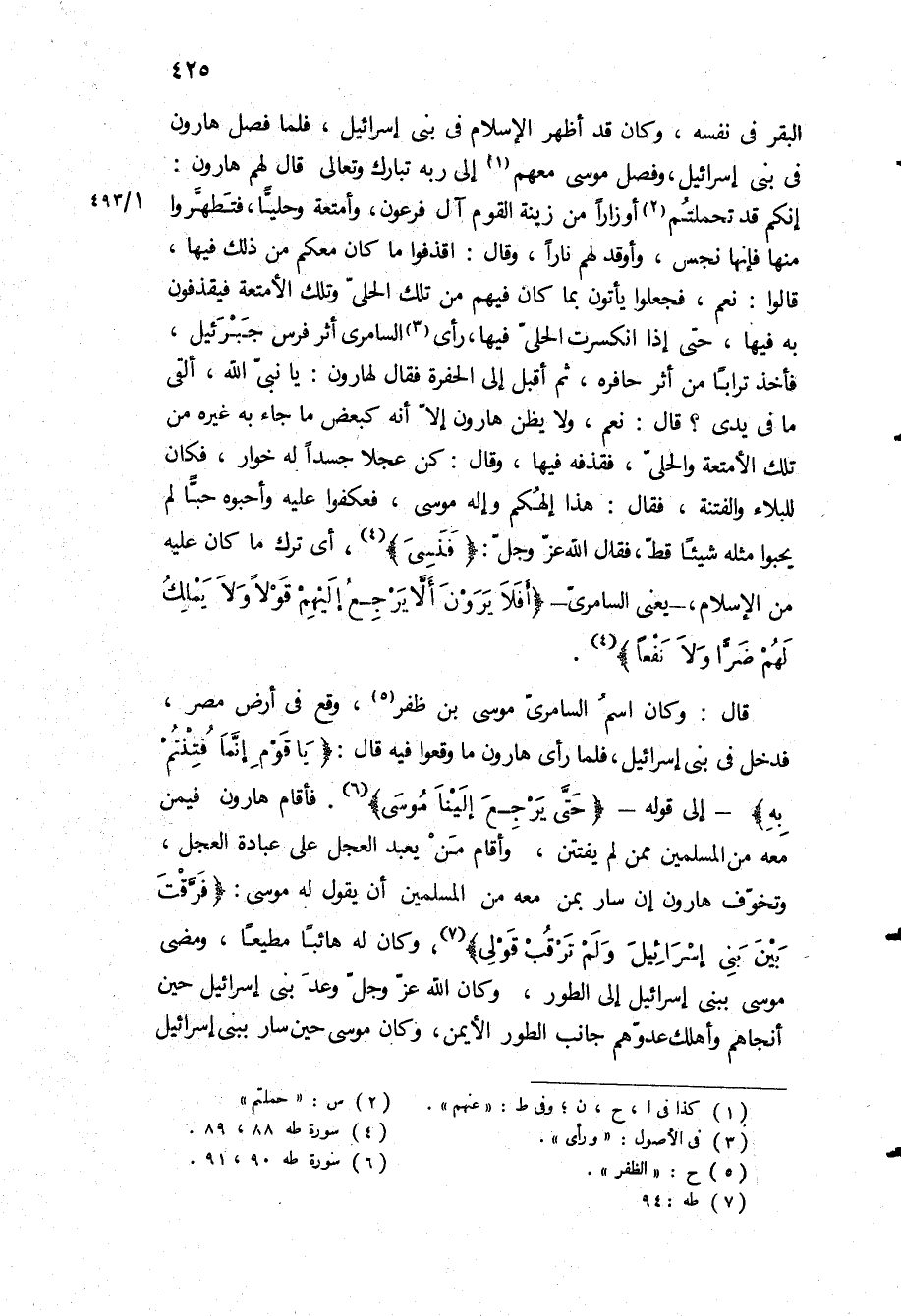 قَالَ: وَكَانَ اسْمُ السَّامِرِيِّ مُوسَى بْنُ ظُفْرٍ، وَقَعَ فِي أَرْضِ مِصْرَ، فَدَخَلَ فِي بَنِي إِسْرَائِيلَ، فَلَمَّا رَأَى هَارُونُ مَا وَقَعُوا فِيهِ قَالَ: «يَا قَوْمِ إِنَّما فُتِنْتُمْ بِهِ» - إلى قوله- «حَتَّى يَرْجِعَ إِلَيْنا مُوسى» فَأَقَامَ هَارُونُ فِيمَنْ مَعَهُ مِنَ الْمُسْلِمِينَ مِمَّنْ لَمْ يُفْتَتَنْ، وَأَقَامَ مَنْ يَعْبُدُ الْعِجْلَ عَلَى عِبَادَةِ الْعِجْلِ، وَتَخَوَّفَ هَارُونُ إِنْ سَارَ بِمَنْ مَعَهُ مِنَ الْمُسْلِمِينَ أَنْ يَقُولَ لَهُ مُوسَى: «َّقْتَ بَيْنَ بَنِي إِسْرائِيلَ وَلَمْ تَرْقُبْ قَوْلِي