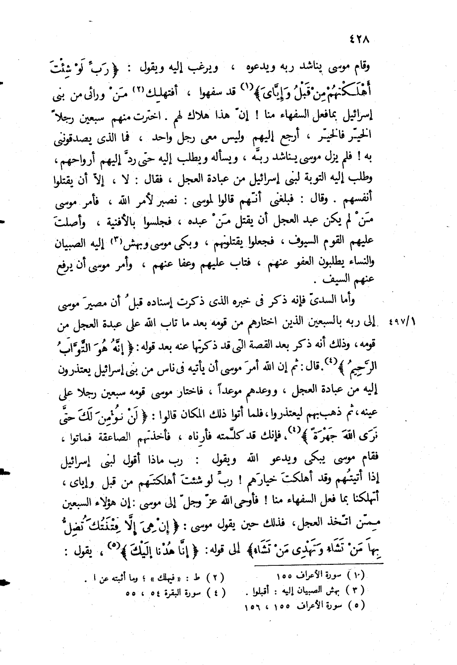 وَقَامَ مُوسَى يُنَاشِدُ رَبَّهُ وَيَدْعُوهُ، وَيَرْغَبُ إِلَيْهِ وَيَقُولُ: «رَبِّ لَوْ شِئْتَ أَهْلَكْتَهُمْ مِنْ قَبْلُ وَإِيَّايَ» قد سفهوا، افتهلك مَنْ وَرَائِي مِنْ بَنِي إِسْرَائِيلَ بِمَا فَعَلَ السفهاء منا! ان هذا هلاك لهم اخْتَرْتُ مِنْهُمْ سَبْعِينَ رَجُلًا الْخَيِّرَ فَالْخَيِّرَ، أَرْجِعُ إِلَيْهِمْ وَلَيْسَ مَعِي رَجُلٌ وَاحِدٌ، فَمَا الَّذِي يُصَدِّقُونَنِي بِهِ! فَلَمْ يَزَلْ مُوسَى يُنَاشِدُ رَبَّهُ، وَيَسْأَلُهُ وَيَطْلَبُ إِلَيْهِ حَتَّى رَدَّ إِلَيْهِمْ أَرْوَاحَهُمْ، وَطَلَبَ إِلَيْهِ التَّوْبَةَ لِبَنِي إِسْرَائِيلَ مِنْ عِبَادَةِ الْعِجْلِ، فَقَالَ: لا، إِلَّا أَنْ يَقْتُلُوا أَنْفُسَهُمْ وَقَالَ: فَبَلَغَنِي أَنَّهُمْ قَالُوا لِمُوسَى: نَصْبِرُ لِأَمْرِ اللَّهِ، فَأَمَرَ مُوسَى مَنْ لَمْ يَكُنْ عَبَدَ الْعِجْلَ أَنْ يَقْتُلَ مَنْ عَبَدَهُ، فَجَلَسُوا بِالأَفْنِيَةِ، وَأَصْلَتَ عَلَيْهِمُ الْقَوْمُ السُّيُوفَ، فَجَعَلُوا يَقْتُلُونَهُمْ، وَبَكَى مُوسَى وَبَهَشَ إِلَيْهِ الصِّبْيَانُ وَالنِّسَاءُ يَطْلُبُونَ الْعَفْوَ عَنْهُمْ، فَتَابَ عَلَيْهِمْ وَعَفَا عَنْهُمْ، وَأَمَرَ مُوسَى أَنْ يَرْفَعَ عَنْهُمُ السَّيْفَ.