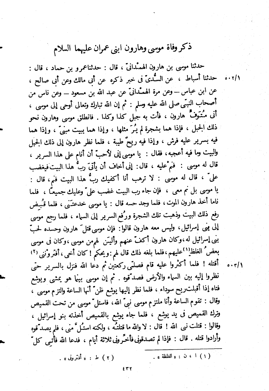حدثنا أسباط، عن السدي في خبر ذكره عن أبي مالك وعن أبي صالح، عن ابن عباس- وعن مرة الهمداني عن عبد الله بن مسعود- وعن ناس من اصحاب النبي ص: ثُمَّ إِنَّ اللَّهَ تَبَارَكَ وَتَعَالَى أَوْحَى إِلَى مُوسَى، أَنِّي مُتَوَفِّ هَارُونَ، فَأْتِ بِهِ جَبَلَ كَذَا وَكَذَا فَانْطَلَقَ مُوسَى وَهَارُونَ نَحْوَ ذَلِكَ الْجَبَلِ، فَإِذَا هُمَا بِشَجَرَةٍ لَمْ يُرَ مِثْلُهَا، وَإِذَا هُمَا بِبَيْتٍ مَبْنِيٍّ، وَإِذَا هُمَا فِيهِ بِسَرِيرٍ عَلَيْهِ فرْشٌ، وَإِذَا فِيهِ رِيحٌ طَيِّبَةٌ، فَلَمَّا نَظَرَ هَارُونُ إِلَى ذَلِكَ الْجَبَلِ وَالْبَيْتِ وَمَا فِيهِ أَعْجَبَهُ، فَقَالَ: يَا مُوسَى إِنِّي لَأُحِبُّ أَنْ أَنَامَ عَلَى هَذَا السَّرِيرِ، قَالَ لَهُ مُوسَى: فَنَمْ عَلَيْهِ، قَالَ: إِنِّي أَخَافَ أَنْ يَأْتِيَ رَبُّ هَذَا الْبَيْتِ فَيَغْضَبَ عَلَيَّ، قَالَ لَهُ مُوسَى: لَا تَرْهَبْ أَنَا أَكْفِيكَ رَبَّ هَذَا الْبَيْتِ فَنَمْ، قَالَ: