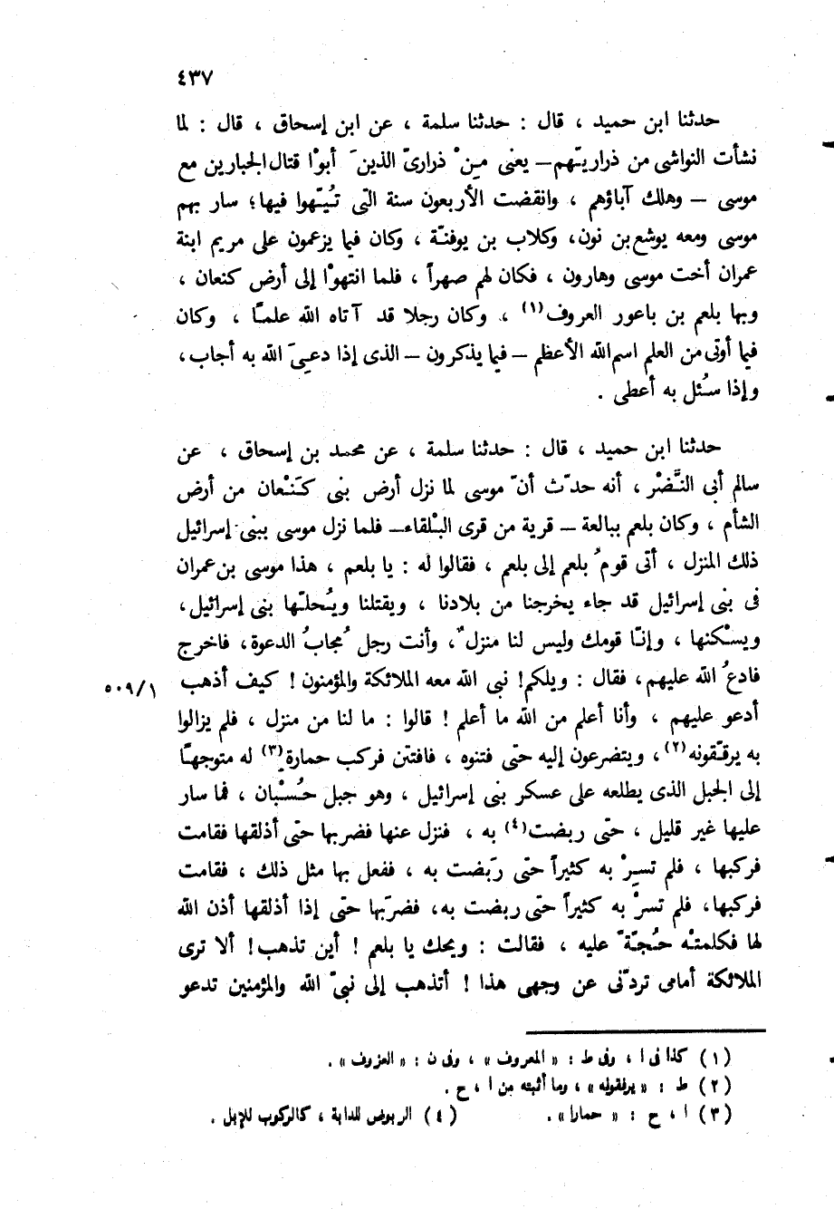 حَدَّثَنَا ابن حميد، قَالَ: حَدَّثَنَا سلمة، عَنْ مُحَمَّدِ بْنِ إسحاق، عن سالم أبي النضر، أنه حدث أن موسى لما نزل أرض بني كنعان من أرض الشام، وكان بلعم ببالعة- قرية من قرى البلقاء- فلما نزل موسى ببني إسرائيل ذلك المنزل، أتى قوم بلعم إلى بلعم، فقالوا له: يا بلعم، هذا موسى بن عمران في بني إسرائيل قد جاء يخرجنا من بلادنا، ويقتلنا ويحلها بني إسرائيل، ويسكنها، وإنا قومك وليس لنا منزل، وأنت رجل مجاب الدعوة، فاخرج فادع الله عليهم، فقال: ويلكم! نبي الله معه الملائكة والمؤمنون! كيف أذهب أدعو عليهم، وأنا أعلم من الله ما أعلم! قَالُوا: ما لنا من منزل، فلم يزالوا به يرققونه، ويتضرعون إليه حتى فتنوه، فافتتن فركب حمارة له متوجها إلى الجبل الذي يطلعه على عسكر بني إسرائيل، وهو جبل حسبان، فما سار عليها غير قليل، حتى ربضت به، فنزل عنها فضربها حتى اذلقها فقامت فركبها، فلم تسر به كثيرا حتى ربضت به، ففعل بها مثل ذلك، فقامت فركبها، فلم تسر به كثيرا حتى ربضت به، فضربها حتى إذا أذلقها أذن الله لها فكلمته حجة عليه، فقالت: ويحك يا بلعم! أين تذهب! ألا ترى الملائكة أمامي تردني عن وجهي هذا! أتذهب إلى نبي الله والمؤمنين تدعو
