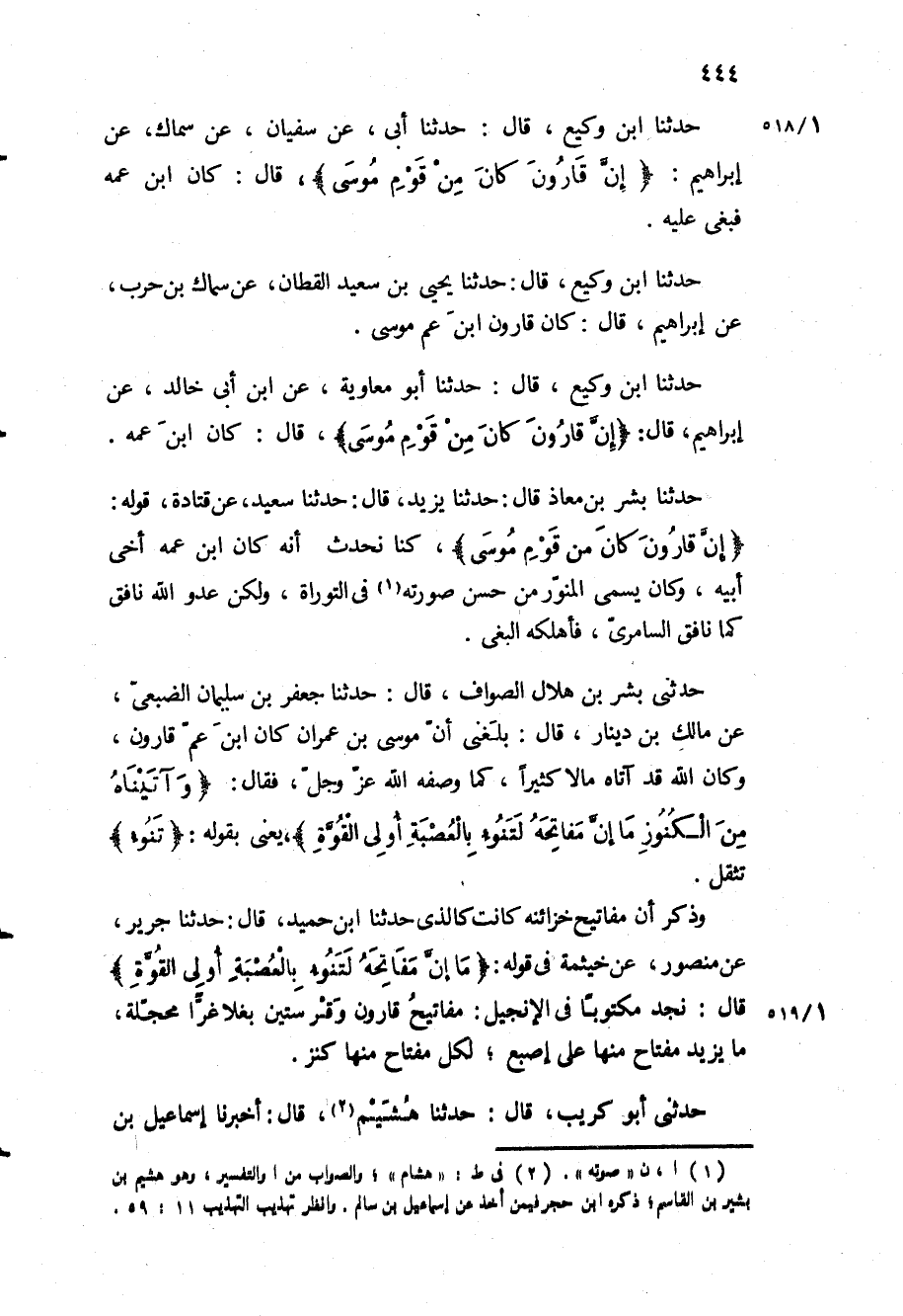 حَدَّثَنَا ابْنُ وَكِيعٍ، قَالَ: حَدَّثَنَا أبو معاوية، عن ابن أبي خالد، عن إبراهيم، قَالَ: «إِنَّ قارُونَ كانَ مِنْ قَوْمِ مُوسى» ، قَالَ: كان ابن عمه.