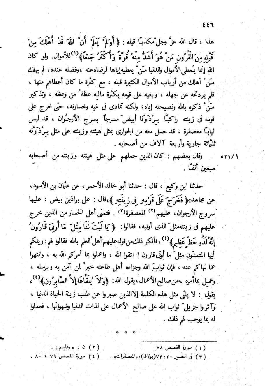 حَدَّثَنَا ابْنُ وَكِيعٍ، قَالَ: حَدَّثَنَا أبو خالد الأحمر، عن عثمان بن الأسود، عن مجاهد: «فَخَرَجَ عَلى قَوْمِهِ فِي زِينَتِهِ» ، قَالَ: على براذين بيض، عليها سروج الأرجوان، عليهم المعصفرة فتمنى أهل الخسار من الذين خرج عليهم في زينته مثل الذي أوتيه، فقالوا: «يَا لَيْتَ لَنا مِثْلَ مَا أُوتِيَ قارُونُ إِنَّهُ لَذُو حَظٍّ عَظِيمٍ» ، فأنكر ذلك من قوله عليهم أهل العلم بالله فقالوا لهم: ويلكم أيها المتمنون مثل ما أوتي قارون! اتقوا الله، واعملوا بما أمركم الله به، وانتهوا عما نهاكم عنه، فإن ثواب الله وجزاءه أهل طاعته خير لمن آمن به وبرسله، وعمل بما أمره به من صالح الأعمال، يقول الله: «وَلا يُلَقَّاها إِلَّا الصَّابِرُونَ» ، يقول: لا يلقى مثل هذه الكلمة إلا الذين صبروا عن طلب زينة الحياة الدنيا، وآثروا جزيل ثواب الله على صالح الأعمال على لذات الدنيا وشهواتها، فعملوا له بما يوجب لهم ذلك