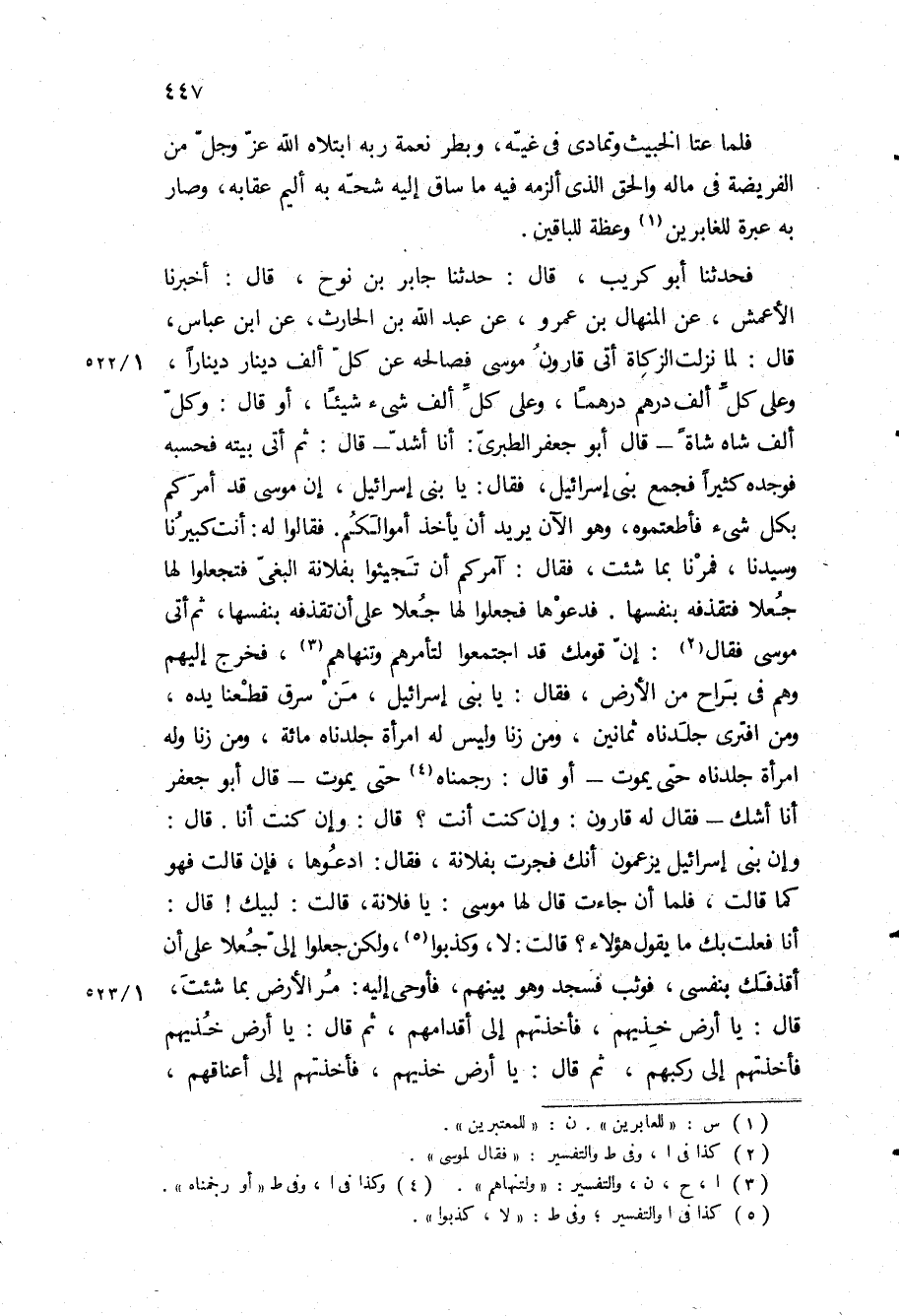 فَحَدَّثَنَا أَبُو كريب، قال: حدثنا جابر بن نوح، قال: أَخْبَرَنَا الْأَعْمَشُ، عَنِ الْمِنْهَالِ بْنِ عَمْرٍو، عَنْ عَبْدِ اللَّهِ بْنِ الْحَارِثِ، عَنِ ابْنِ عَبَّاسٍ، قَالَ: لَمَّا نَزَلَتِ الزَّكَاةُ أَتَى قَارُونَ مُوسَى فَصَالَحَهُ عَنْ كُلِّ أَلْفِ دِينَارٍ دِينَارًا، وَعَلَى كُلِّ أَلْفِ دِرْهَمٍ دِرْهَمًا، وَعَلَى كُلِّ أَلْفِ شَيْءٍ شَيْئًا، أَوْ قَالَ: وَكُلِّ أَلْفِ شَاةٍ شاه- قال ابو جعفر الطبرى: انا أشد- قَالَ: ثُمَّ أَتَى بَيْتَهُ فَحَسَبَهُ فَوَجَدَهُ كَثِيرًا فَجَمَعَ بَنِي إِسْرَائِيلَ، فَقَالَ: يَا بَنِي إِسْرَائِيلَ، إِنَّ مُوسَى قَدْ أَمَرَكُمْ بِكُلِّ شَيْءٍ فَأَطَعْتُمُوهُ، وَهُوَ الآنَ يُرِيدُ أَنْ يَأْخُذَ أَمْوَالَكُمْ فَقَالُوا لَهُ: أَنْتَ كَبِيرُنَا وَسَيِّدُنَا، فَمُرْنَا بِمَا شِئْتَ، فَقَالَ: آمُرُكُمْ أَنْ تَجِيئُوا بِفُلَانَةَ الْبَغِيِّ فَتَجْعَلُوا لَهَا جُعْلًا فَتَقْذِفُهُ بِنَفْسِهَا فَدَعَوْهَا فَجَعَلُوا لَهَا جُعْلًا عَلَى أَنْ تَقْذِفَهُ بِنَفْسِهَا، ثُمَّ أَتَى موسى فقال: إِنَّ قَوْمَكَ قَدِ اجْتَمَعُوا لِتَأْمُرَهُمْ وَتَنْهَاهُمْ، فَخَرَجَ إِلَيْهِمْ وَهُمْ فِي بَرَاحٍ مِنَ الْأَرْضِ، فَقَالَ: يَا بَنِي إِسْرَائِيلَ، مَنْ سَرَقَ قَطَعْنَا يَدَهُ، ومن افترى جلدناه ثمانين، ومن زنا وليس له امراه جلدناه مائه، ومن زنا وَلَهُ امْرَأَةٌ جَلَدْنَاهُ حَتَّى يَمُوتَ- أَوْ قَالَ: رَجَمْنَاهُ حَتَّى يَمُوتَ- قَالَ أَبُو جَعْفَرَ أَنَا أَشُكُّ- فَقَالَ لَهُ قَارُونُ: وَإِنْ كُنْتَ أَنْتَ؟ قَالَ: وَإِنْ كُنْتُ أَنَا قَالَ: