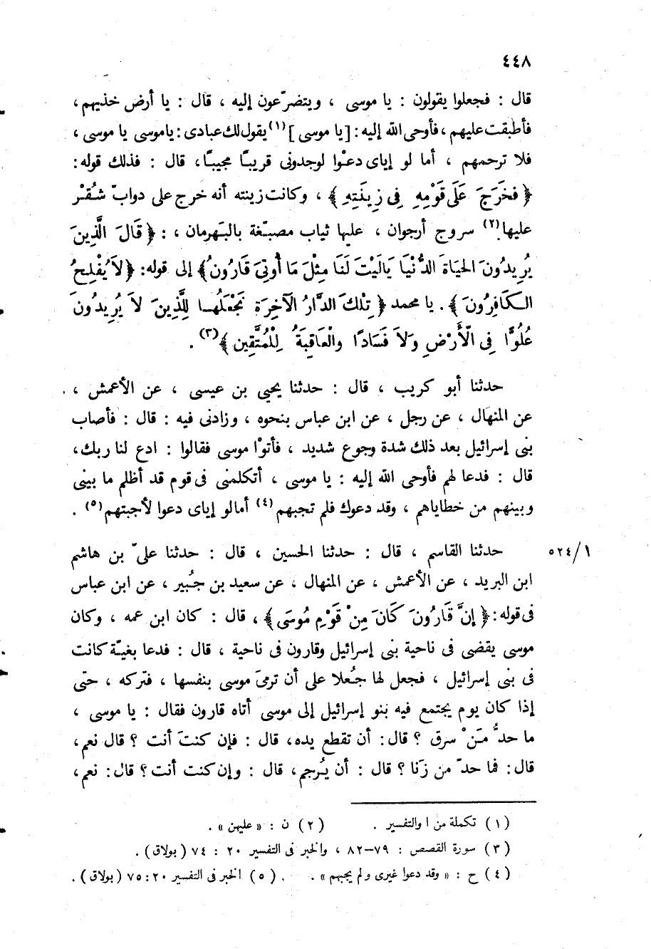 حَدَّثَنَا الْقَاسِمُ، قَالَ: حَدَّثَنَا الْحُسَيْنُ، قَالَ: حَدَّثَنَا عَلِيُّ بْنُ هَاشِمِ ابْنُ الْبُرَيْدِ، عَنِ الْأَعْمَشِ، عَنِ المنهال، عَنْ سَعِيدِ بْنِ جُبَيْرٍ، عَنِ ابْنِ عَبَّاسٍ فِي قَوْلِهِ: «إِنَّ قارُونَ كانَ مِنْ قَوْمِ مُوسى» ، قَالَ: كَانَ ابْنَ عَمِّهِ، وَكَانَ مُوسَى يَقْضِي فِي نَاحِيَةِ بَنِي إِسْرَائِيلَ وَقَارُونُ فِي نَاحِيَةٍ، قَالَ: فَدَعَا بَغِيَّةً كَانَتْ فِي بَنِي إِسْرَائِيلَ، فَجَعَلَ لَهَا جُعْلًا عَلَى أَنْ تَرْمِيَ مُوسَى بِنَفْسِهَا، فَتَرَكَهُ، حَتَّى إِذَا كَانَ يَوْمَ يَجْتَمِعُ فِيهِ بَنُو إِسْرَائِيلَ إِلَى مُوسَى أَتَاهُ قَارُونُ فَقَالَ: يَا مُوسَى، مَا حَدُّ مَنْ سَرَقَ؟ قَالَ: أَنْ تُقْطَعَ يَدُهُ، قَالَ: فَإِنْ كُنْتَ أَنْتَ؟ قَالَ نَعَمْ، قَالَ: فَمَا حَدُّ مَنْ زنا؟ قَالَ: أَنْ يُرْجَمَ، قَالَ: وَإِنْ كُنْتَ أَنْتَ؟ قال: نعم،