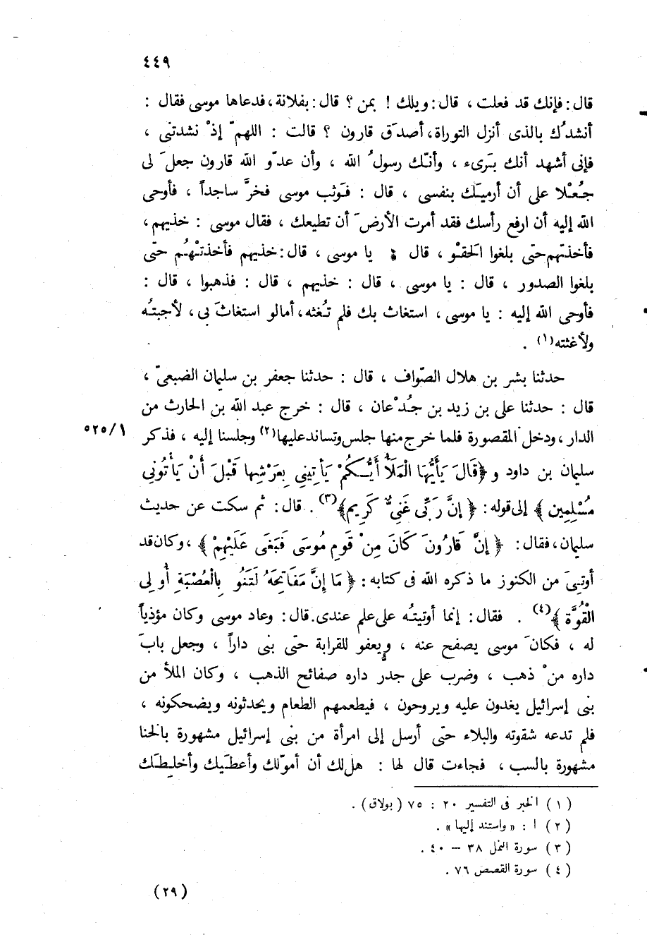 حَدَّثَنَا بشر بن هلال الصواف، قَالَ: حَدَّثَنَا جعفر بن سليمان الضبعي، قَالَ: حَدَّثَنَا علي بن زيد بن جدعان، قَالَ: خرج عبد الله بن الحارث من الدار، ودخل المقصورة فلما خرج منها جلس وتساند عليها وجلسنا اليه، فذكر سليمان بن داود و «قالَ يا أَيُّهَا الْمَلَؤُا أَيُّكُمْ يَأْتِينِي بِعَرْشِها قَبْلَ أَنْ يَأْتُونِي مُسْلِمِينَ» الى قوله: «فَإِنَّ رَبِّي غَنِيٌّ كَرِيمٌ» قَالَ: ثم سكت عن حديث سليمان، فقال: «إِنَّ قارُونَ كانَ مِنْ قَوْمِ مُوسى فَبَغى عَلَيْهِمْ» ، وكان قد أوتي من الكنوز ما ذكره الله في كتابه: «ما إِنَّ مَفاتِحَهُ لَتَنُوأُ بِالْعُصْبَةِ أُولِي الْقُوَّةِ» فقال: انما أوتيته على علم عندي قَالَ: وعاد موسى وكان مؤذيا له، فكان موسى يصفح عنه، ويعفو للقرابة حتى بنى دارا، وجعل باب داره من ذهب، وضرب على جدر داره صفائح الذهب، وكان الملأ من بني إسرائيل يغدون عليه ويروحون، فيطعمهم الطعام ويحدثونه ويضحكونه، فلم تدعه شقوته والبلاء حتى أرسل إلى امرأة من بني إسرائيل مشهورة بالخنا مشهورة بالسب، فجاءت قال لها: هل لك أن أمولك وأعطيك وأخلطك