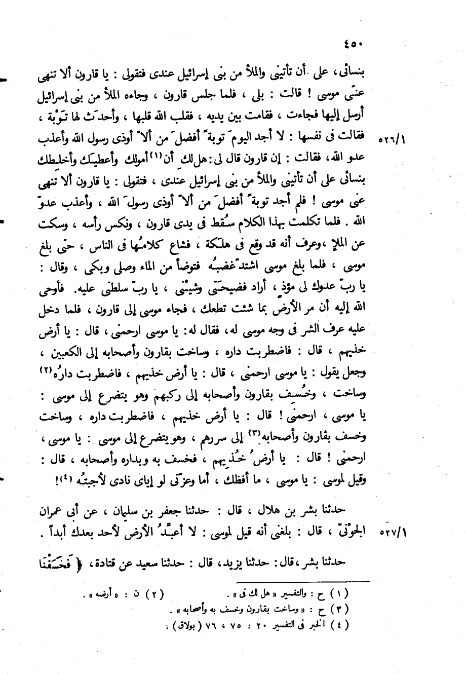 يا موسي، ارحمني! قَالَ: يا أرض خذيهم، فاضطربت داره، وساخت وخسف بقارون وأصحابه إلى سررهم، وهو يتضرع إلى موسي: يا موسي، ارحمني! قال: يا أرض خذيهم، فخسف به وبداره وأصحابه، قَالَ: