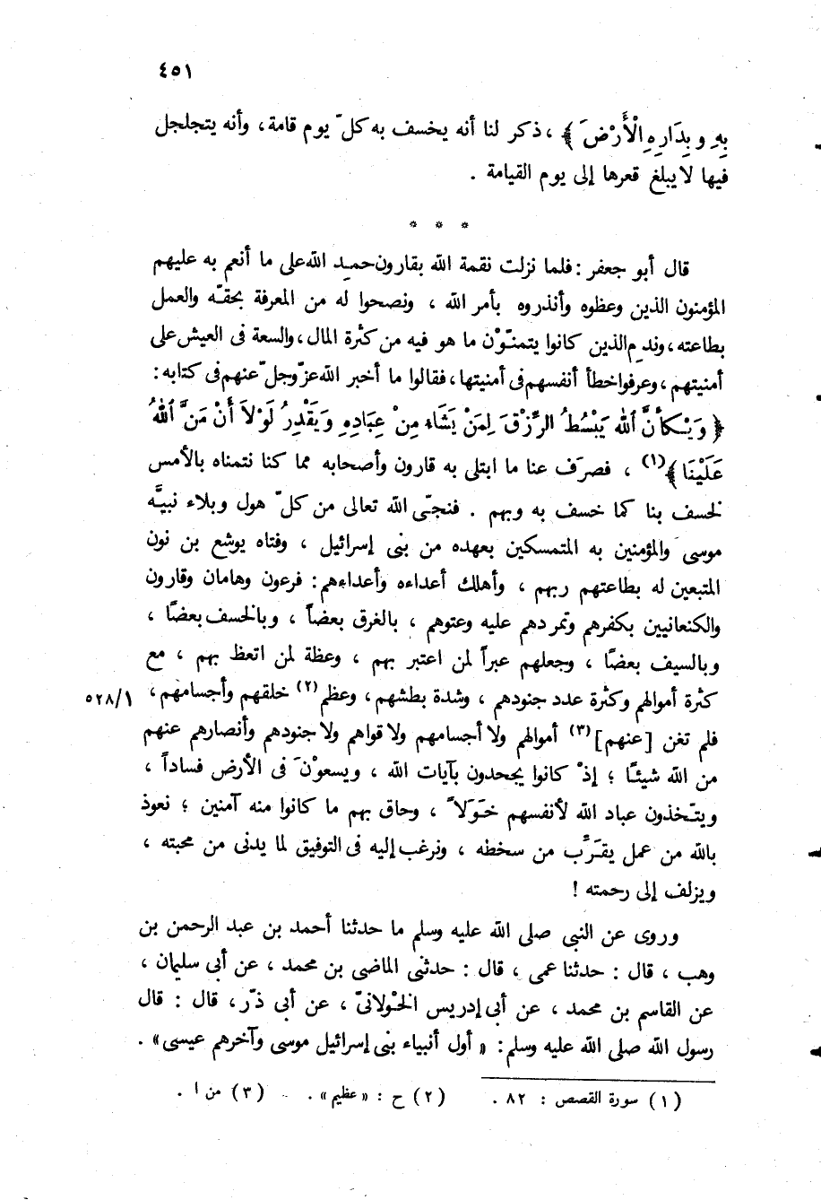 «وَيْكَأَنَّ اللَّهَ يَبْسُطُ الرِّزْقَ لِمَنْ يَشاءُ مِنْ عِبادِهِ وَيَقْدِرُ لَوْلا أَنْ مَنَّ اللَّهُ عَلَيْنا» ، فصرف عنا ما ابتلى به قارون وأصحابه مما كنا نتمناه بالأمس لخسف بنا كما خسف به وبهم فنجى الله تعالى من كل هول وبلاء نبيه موسى والمؤمنين به المتمسكين بعهده من بني إسرائيل، وفتاه يوشع بن نون المتبعين له بطاعتهم ربهم، واهلك اعدائه واعدائهم: فرعون وهامان وقارون والكنعانيين بكفرهم وتمردهم عليه وعتوهم، بالغرق بعضا، وبالخسف بعضا، وبالسيف بعضا، وجعلهم عبرا لمن اعتبر بهم، وعظة لمن اتعظ بهم، مع كثرة أموالهم وكثرة عدد جنودهم، وشدة بطشهم، وعظم خلقهم وأجسامهم، فلم تغن عنهم أموالهم ولا أجسامهم ولا قواهم ولا جنودهم وأنصارهم عنهم من الله شيئا، إذ كانوا يجحدون بآيات الله، ويسعون في الأرض فسادا، ويتخذون عباد الله لأنفسهم خولا، وحاق بهم ما كانوا منه آمنين، نعوذ بالله من عمل يقرب من سخطه، ونرغب إليه في التوفيق لما يدني من محبته، ويزلف الى رحمته! وروى عن النبي ص مَا حَدَّثَنَا أَحْمَدُ بْنُ عَبْدِ الرَّحْمَنِ بْنِ وَهْبٍ، قَالَ: حَدَّثَنَا عَمِّي، قَالَ: حَدَّثَنِي الْمَاضِي بْنُ مُحَمَّدٍ، عَنْ أَبِي سُلَيْمَانَ، عَنِ الْقَاسِمِ بْنِ مُحَمَّدٍ، عَنْ أَبِي إِدْرِيسَ الْخَوْلانِيِّ، عَنْ ابى ذر، قال: [قال رسول الله ص: أَوَّلُ أَنْبِيَاءِ بَنِي إِسْرَائِيلَ موسى وَآخِرُهُمْ عِيسَى