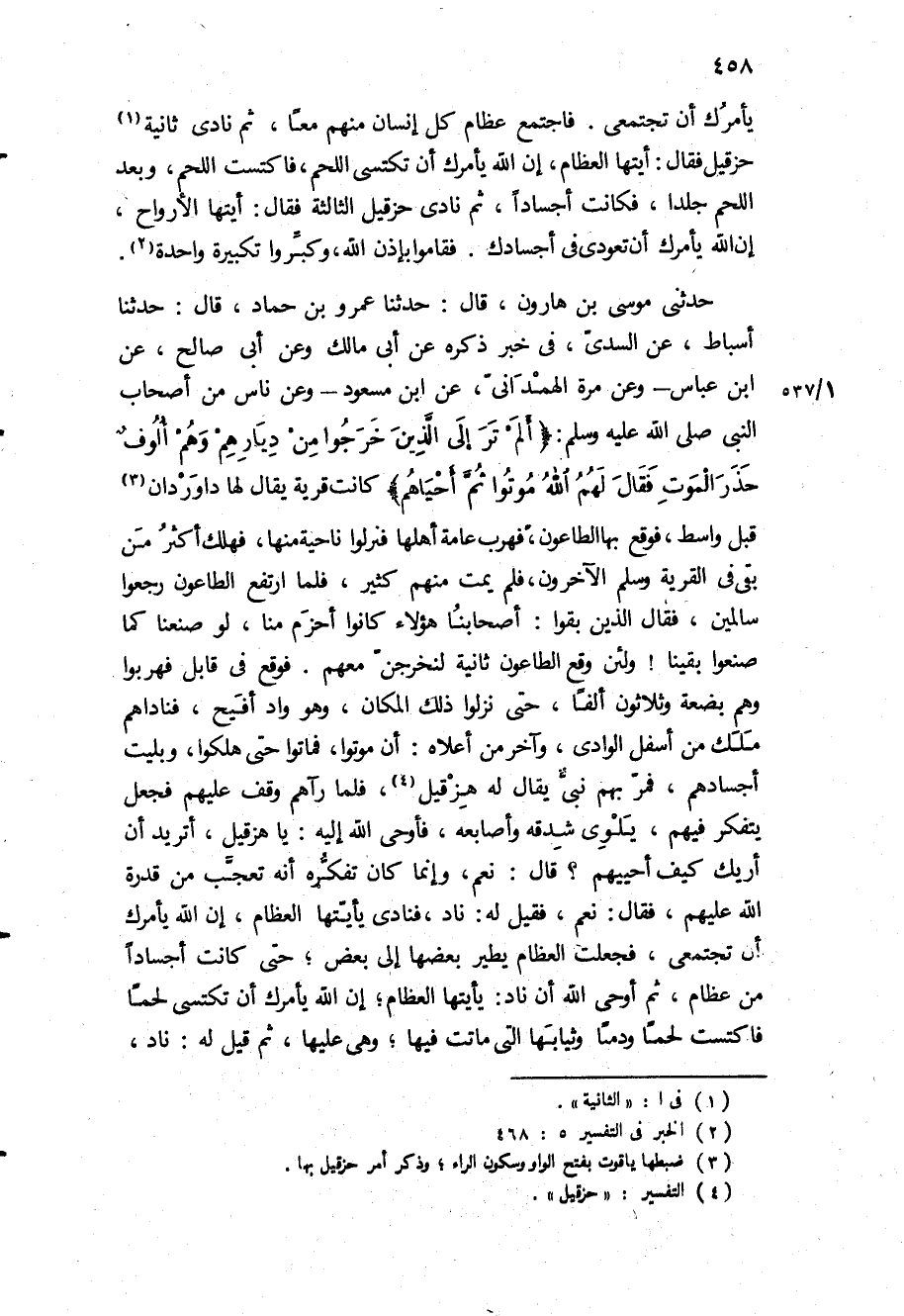 حدثني موسى بن هارون، قال: حدثنا عمرو بن حماد، قال: حدثنا أسباط، عن السدي، في خبر ذكره عن أبي مالك وعن أبي صالح، عن ابن عباس- وعن مرة الهمداني، عن ابن مسعود- وعن ناس من اصحاب النبي ص «أَلَمْ تَرَ إِلَى الَّذِينَ خَرَجُوا مِنْ دِيارِهِمْ وَهُمْ أُلُوفٌ حَذَرَ الْمَوْتِ فَقالَ لَهُمُ اللَّهُ مُوتُوا ثُمَّ أَحْياهُمْ» كَانَتْ قَرْيَةً يُقَالُ لَهَا دَاوِرْدَانَ قَبْلَ وَاسِطَ، فَوَقَعَ بِهَا الطَّاعُونُ، فَهَرَبَ عَامَّةُ أَهْلِهَا فَنَزَلُوا نَاحِيَةً مِنْهَا، فَهَلَكَ أَكْثَرُ مَنْ بَقِيَ فِي الْقَرْيَةِ وَسَلِمَ الآخَرُونَ، فَلَمْ يَمُتْ مِنْهُمْ كَثِيرٌ، فَلَمَّا ارْتَفَعَ الطَّاعُونُ رَجَعُوا سَالِمِينَ، فَقَالَ الَّذِينَ بَقَوْا: أَصْحَابُنَا هَؤُلَاءِ كَانُوا أَحْزَمَ مِنَّا، لَوْ صَنَعْنَا كَمَا صَنَعُوا بَقِينَا! وَلَئِنْ وَقَعَ الطَّاعُونُ ثَانِيَةً لَنَخْرُجَنَّ مَعَهُمْ فَوَقَعَ فِي قَابِلَ فَهَرَبُوا وَهُمْ بِضْعَةٌ وَثَلاثُونَ أَلْفًا، حَتَّى نَزَلُوا ذَلِكَ الْمَكَانَ، وَهُوَ وَادٍ أَفْيَحُ، فَنَادَاهُمْ مَلَكٌ مِنْ أَسْفَلِ الْوَادِي، وَآخَرُ مِنْ أَعْلَاهُ: أَنْ مُوتُوا، فَمَاتُوا حَتَّى هَلَكُوا، وَبَلِيَتْ أَجْسَادُهُمْ، فَمَرَّ بِهِمْ نبى يقال له هزقيل، فَلَمَّا رَآهُمْ وَقَفَ عَلَيْهِمْ فَجَعَلَ يَتَفَكَّرُ فِيهِمْ، يَلْوِي شِدْقَهُ وَأَصَابِعَهُ، فَأَوْحَى اللَّهُ إِلَيْهِ: يَا هزقيل، أَتُرِيدُ أَنْ أُرِيكَ كَيْفَ أُحْيِيهِمْ؟ قَالَ: نَعَمْ، وَإِنَّمَا كَانَ تَفَكُّرُهُ أَنَّهُ تَعَجَّبَ مِنْ قُدْرَةِ اللَّهِ عَلَيْهِمْ، فَقَالَ: نَعَمْ، فَقِيلَ لَهُ: نَادِ، فنادى يا أيتها الْعِظَامُ، إِنَّ اللَّهَ يَأْمُرُكِ أَنْ تَجْتَمِعِي، فَجَعَلَتِ الْعِظَامُ يَطِيرُ بَعْضُهَا إِلَى بَعْضٍ، حَتَّى كَانَتْ أَجْسَادًا مِنْ عِظَامٍ، ثُمَّ أَوْحَى اللَّهُ أَنْ ناد: يأتيها الْعِظَامُ، إِنَّ اللَّهُ يَأْمُرُكِ أَنْ تَكْتَسِيَ لَحْمًا فَاكْتَسَتْ لَحْمًا وَدَمًا وَثِيَابَهَا الَّتِي مَاتَتْ فِيهَا، وَهِيَ عَلَيْهَا، ثُمَّ قِيلَ لَهُ: نَادِ،
