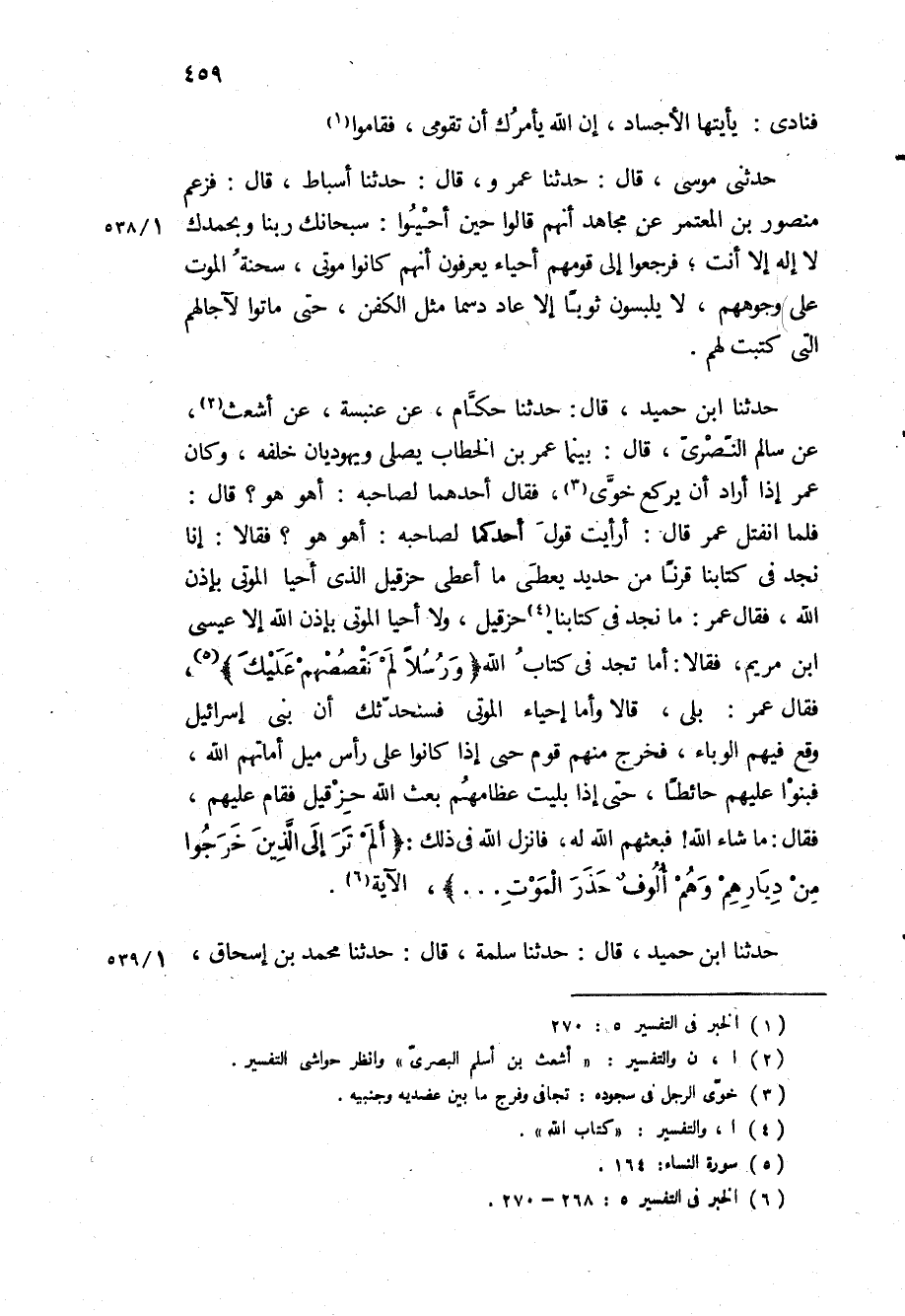 فلما انفتل عمر قَالَ: أرأيت قول أحدكما لصاحبه: أهو هو؟ فقالا: إنا نجد في كتابنا قرنا من حديد يعطى ما أعطى حزقيل الذي أحيا الموتى بإذن الله، فقال عمر: ما نجد في كتابنا حزقيل، ولا أحيا الموتى بإذن الله إلا عيسى ابن مريم، فقالا: أما تجد في كتاب الله «وَرُسُلًا لَمْ نَقْصُصْهُمْ عَلَيْكَ» ، فقال عمر: بلى، قالا وأما إحياء الموتى فسنحدثك إن بني إسرائيل وقع فيهم الوباء، فخرج منهم قوم حتى إذا كانوا على رأس ميل أماتهم الله، فبنوا عليهم حائطا، حتى إذا بليت عظامهم بعث الله حزقيل فقام عليهم، فقال: ما شاء الله! فبعثهم الله له، فأنزل الله في ذلك: «أَلَمْ تَرَ إِلَى الَّذِينَ خَرَجُوا مِنْ دِيارِهِمْ وَهُمْ أُلُوفٌ حَذَرَ الْمَوْتِ» ، الآيَةَ.