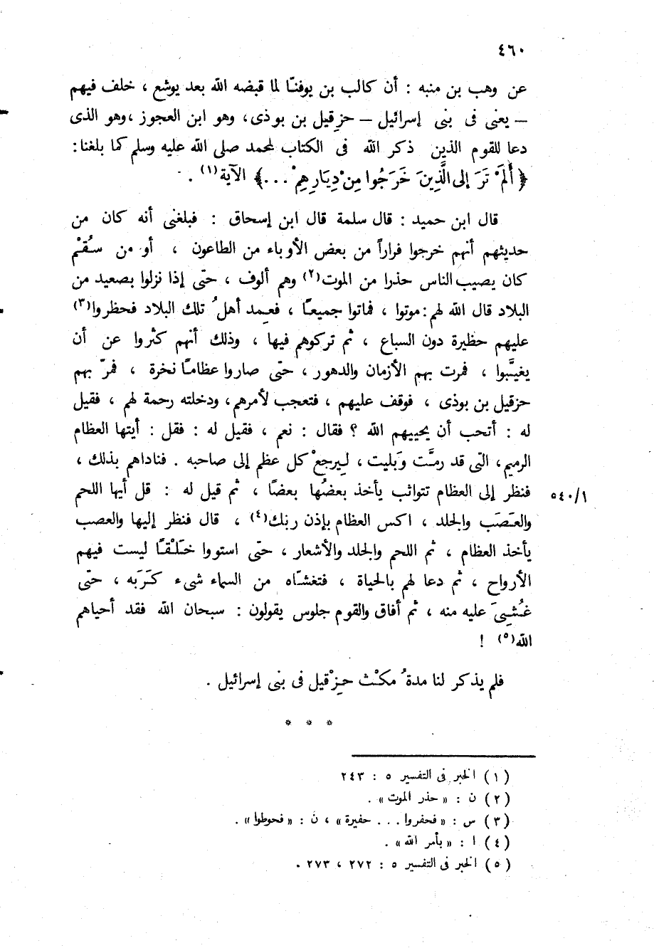 قَالَ ابْنُ حُمَيْدٍ: قَالَ سَلَمَةُ قَالَ ابْنُ إسحاق: فبلغني أنه كان من حديثهم أنهم خرجوا فرارا من بعض الأوباء من الطاعون، أو من سقم كان يصيب الناس حذرا من الموت وهم ألوف، حتى إذا نزلوا بصعيد من البلاد قَالَ الله لهم: موتوا، فماتوا جميعا، فعمد أهل تلك البلاد فحظروا عليهم حظيرة دون السباع، ثم تركوهم فيها، وذلك أنهم كثروا عن أن يغيبوا، فمرت بهم الأزمان والدهور، حتى صاروا عظاما نخرة، فمر بهم حزقيل بن بوذى، فوقف عليهم، فتعجب لأمرهم، ودخلته رحمة لهم، فقيل له: أتحب أن يحييهم الله؟ فقال: نعم، فقيل له: فقل: أيتها العظام الرميم، التي قد رمت وبليت، ليرجع كل عظم إلى صاحبه فناداهم بذلك، فنظر إلى العظام تتواثب يأخذ بعضها بعضا، ثم قيل له: قل أيها اللحم والعصب والجلد، اكس العظام بإذن ربك، قَالَ فنظر إليها والعصب يأخذ العظام، ثم اللحم والجلد والأشعار، حتى استووا خلقا ليست فيهم الأرواح، ثم دعا لهم بالحياة، فتغشاه من السماء شيء كربه، حتى غشي عليه منه، ثم أفاق والقوم جلوس يقولون: سبحان الله فقد أحياهم الله! فلم يذكر لنا مدة مكث حزقيل في بنى إسرائيل