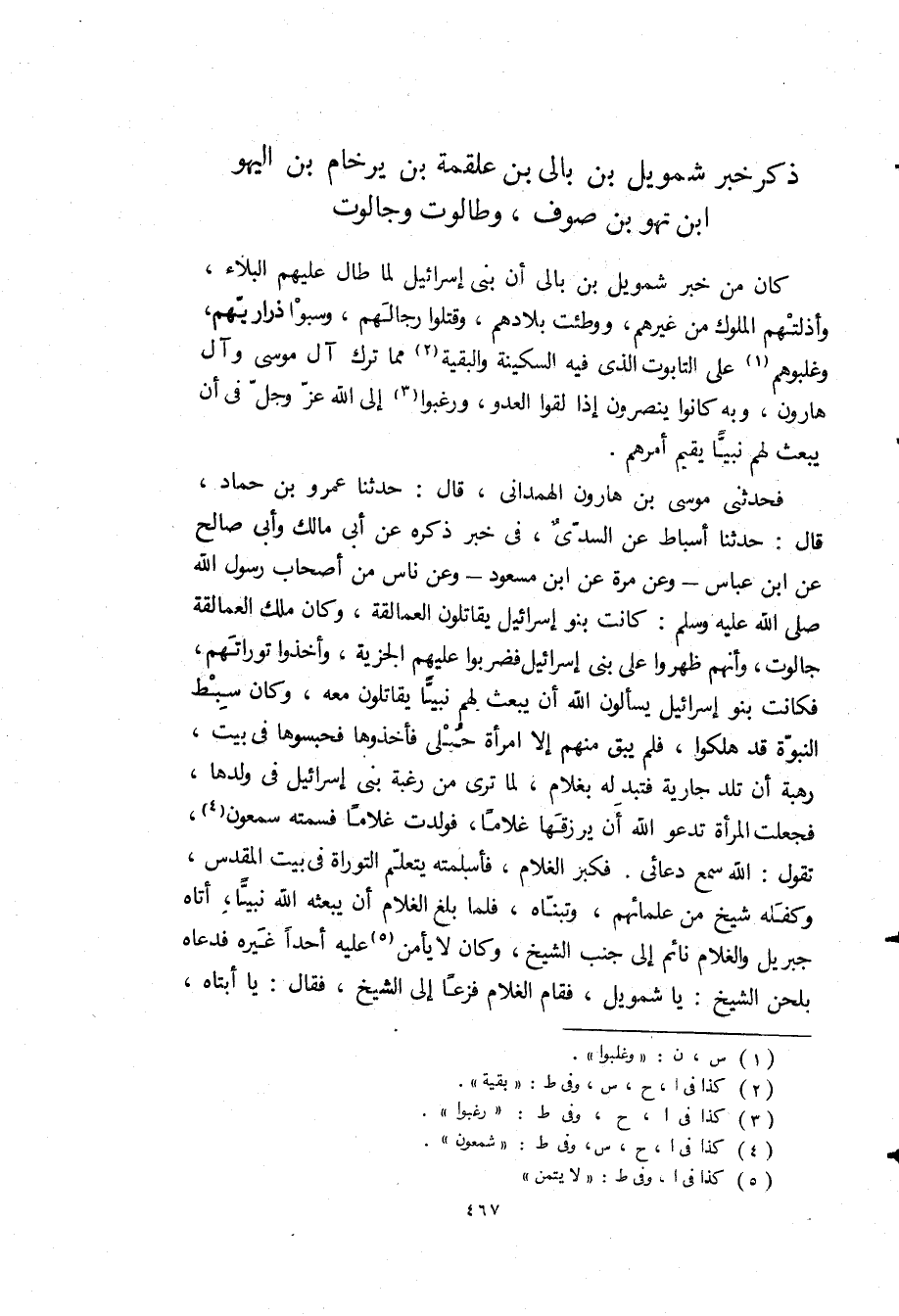 فَحَدَّثَنِي مُوسَى بْنُ هَارُونَ الهمداني، قال: حدثنا عمرو بن حماد، قال: حدثنا أسباط عن السدي، في خبر ذكره عَنْ أَبِي مَالِكٍ وَأَبِي صَالِحٍ عَنِ ابْنِ عَبَّاسٍ- وَعَنْ مُرَّةَ عَنِ ابْنِ مَسْعُودٍ- وَعَنْ ناس من اصحاب رسول الله ص: كَانَتْ بَنُو إِسْرَائِيلَ يُقَاتِلُونَ الْعَمَالِقَةَ، وَكَانَ مَلِكَ الْعَمَالِقَةِ جَالُوتُ، وَأَنَّهُمْ ظَهَرُوا عَلَى بَنِي إِسْرَائِيلَ فَضَرَبُوا عَلَيْهِمُ الْجِزْيَةَ، وَأَخَذُوا تَوْرَاتَهُمْ، فَكَانَتْ بَنُو إِسْرَائِيلَ يَسْأَلُونَ اللَّهَ أَنْ يَبْعَثَ لَهُمْ نَبِيًّا يُقَاتِلُونَ مَعَهُ، وَكَانَ سِبْطُ النُّبُوَّةِ قَدْ هَلَكُوا، فَلَمْ يَبْقَ مِنْهُمْ إِلَّا امْرَأَةٌ حُبْلَى فَأَخَذُوهَا فَحَبَسُوهَا فِي بَيْتٍ، رَهْبَةً أَنْ تَلِدَ جَارِيَةً فتبدله بِغُلَامٍ، لِمَا تَرَى مِنْ رَغْبَةِ بَنِي إِسْرَائِيلَ فِي وَلَدِهَا، فَجَعَلَتِ الْمَرْأَةُ تَدْعُو اللَّهَ أَنْ يرزقها غلاما، فولدت غلاما فسمته سمعون، تَقُولُ: اللَّهُ سَمِعَ دُعَائِيَ فَكَبُرَ الْغُلَامُ، فَأَسْلَمَتْهُ يَتَعَلَّمُ التَّوْرَاةَ فِي بَيْتِ الْمَقْدِسِ، وَكَفَّلَهُ شَيْخٌ مِنْ عُلَمَائِهِمْ، وَتَبَنَّاهُ، فَلَمَّا بَلَغَ الْغُلَامُ أَنْ يَبْعَثَهُ اللَّهُ نَبِيًّا، أَتَاهُ جِبْرِيلُ وَالْغُلَامُ نَائِمٌ الى جنب الشيخ، وكان لا يامن عَلَيْهِ أَحَدًا غَيْرَهُ فَدَعَاهُ بِلَحْنِ الشَّيْخِ: يَا شَمُوِيلُ، فَقَامَ الْغُلَامُ فَزِعًا إِلَى الشَّيْخِ، فَقَالَ: يا أبتاه،